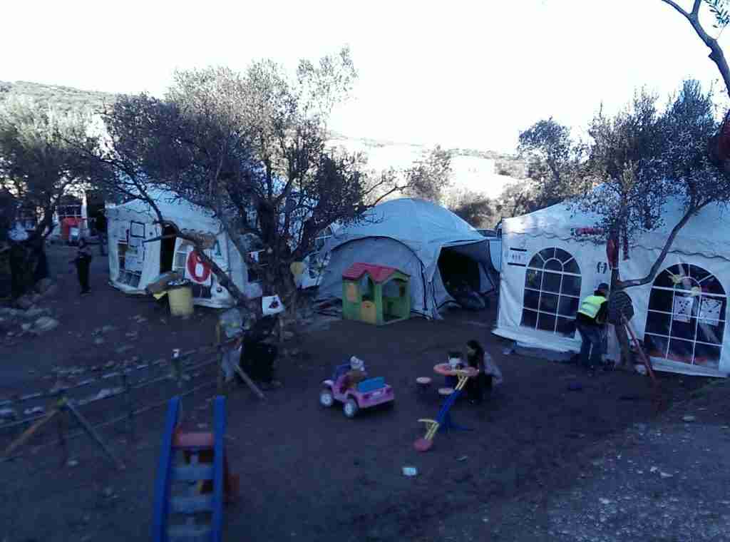 Il campo di Moria è in uno dei posti più isolati e umidi di Lesbo, altrimenti ricoperta di rocce e pascoli qui c’è fango ovunque, un pezzo di terra è franato e alcuni dei rifugiati stanno cercando, con l’aiuto di contadini del luogo, di dare una sistemata. In realtà riusciamo a osservare solo l’appendice esterna del campo, quella che si è sviluppata quando all’interno del campo è finito il posto. La tenda del cibo, il posto in cui prendere vestiti asciutti (una delle cose più preziose per chi arriva), una specie di parchetto giochi per bambini improvvisato.