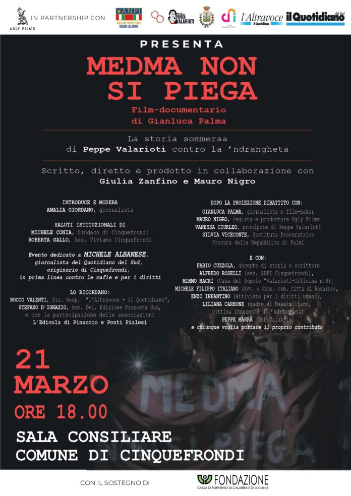 Sabato 21 marzo 2026, alle ore 18, presso la Sala Consiliare del Comune, si terrà la proiezione del film-documentario “Medma non si piega”, diretto da Gianluca Palma e prodotto da Ugly Films, realtà cinematografica che si distingue per la capacità di raccontare con profondità e rigore temi sociali complessi, contribuendo attivamente alla costruzione di una coscienza collettiva consapevole.