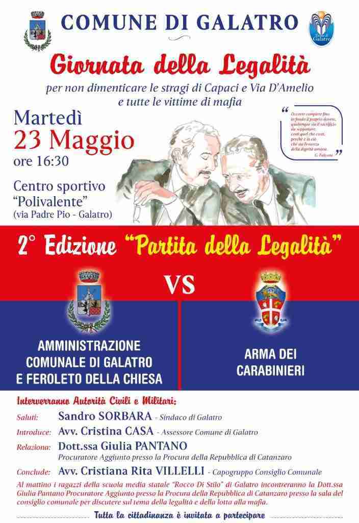 Il prossimo 23 maggio, in occasione del trentunesimo anniversario della Strage di Capaci, l’Amministrazione Comunale di Galatro guidata dal Sindaco Sandro Sorbara, in collaborazione con l’Istituto Comprensivo Laureana-Galatro-Feroleto e l’Arma dei Carabinieri, organizzerà la seconda edizione della “Giornata della Legalità”.