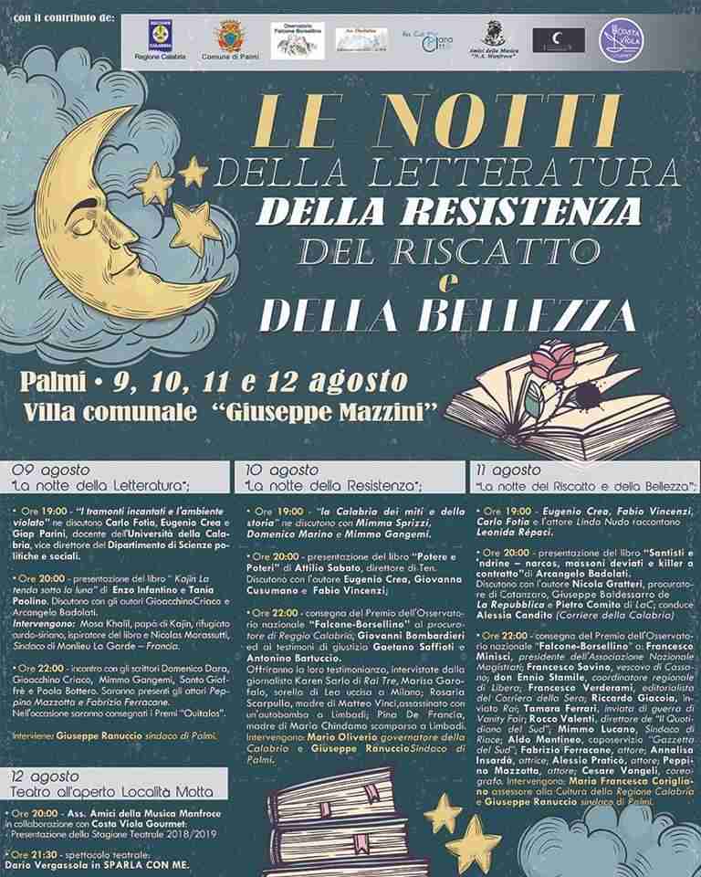 Si chiama “Le Notti della Letteratura, della Resistenza e del Riscatto e della Bellezza” ed è l’evento che l’associazione palmese “Ouitalos”, insieme all’Osservatorio Falcone e Borsellino, alle associazioni “Piana Città” e “Amici della Musica”, con il patrocinio del Comune di Palmi e della Regione Calabria, ha organizzato nelle serate dal 9 al 12 Agosto.