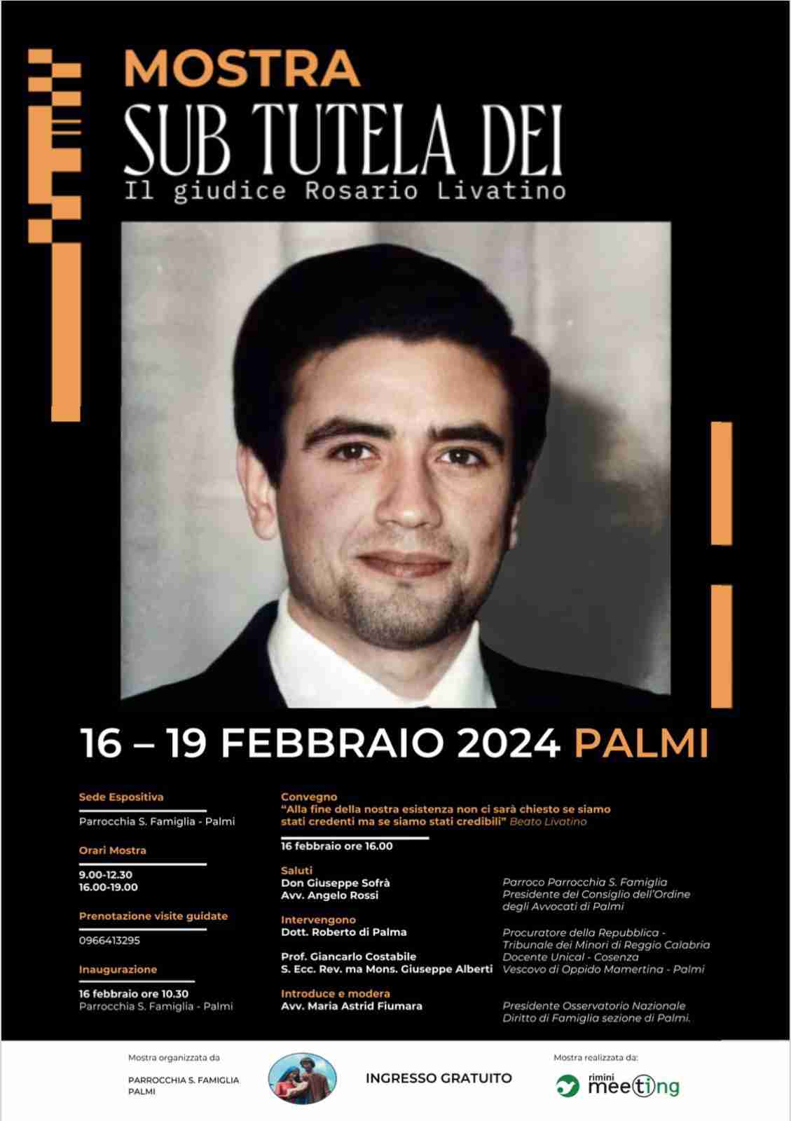 Palmi ricorda il giudice martire di giustizia e fede Rosario Livatino con un viaggio che partirà dalla mostra “Sub Tutela Dei”, proseguirà con la venerazione della sua reliquia alla Parrocchia Santa Famiglia di Palmi e culminerà con eventi, convegni, attività per giovani e adulti, momenti di riflessione su questa figura che seppe far esercitare la legalità facendosi strumento di carità.
