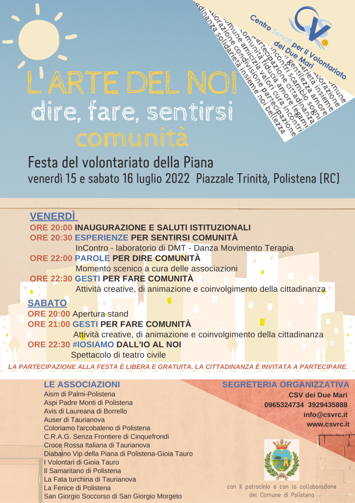 La manifestazione, che si svolgerà nelle sere di venerdì 15 e sabato 16 luglio a Polistena, nel suggestivo scenario del Piazzale Trinità, è promossa e organizzata dal Centro Servizi per il Volontariato dei Due Mari di Reggio Calabria con il patrocinio e con la collaborazione dell’Amministrazione Comunale di Polistena e con l’adesione delle associazioni ASPI Padre Monti, Coloriamo l’arcobaleno, Il Samaritano e La Fenice di Polistena, Auser, Croce Rossa Italiana e La Fata Turchina di Taurianova, Avis di Laureana di Borrello, CRAG Senza Frontiere di Cinquefrondi, San Giorgio Soccorso di San Giorgio Morgeto, Diabaino Vip Vip della Piana e i Volontari di Gioia Tauro e la sezione Aism di Palmi-Polistena.