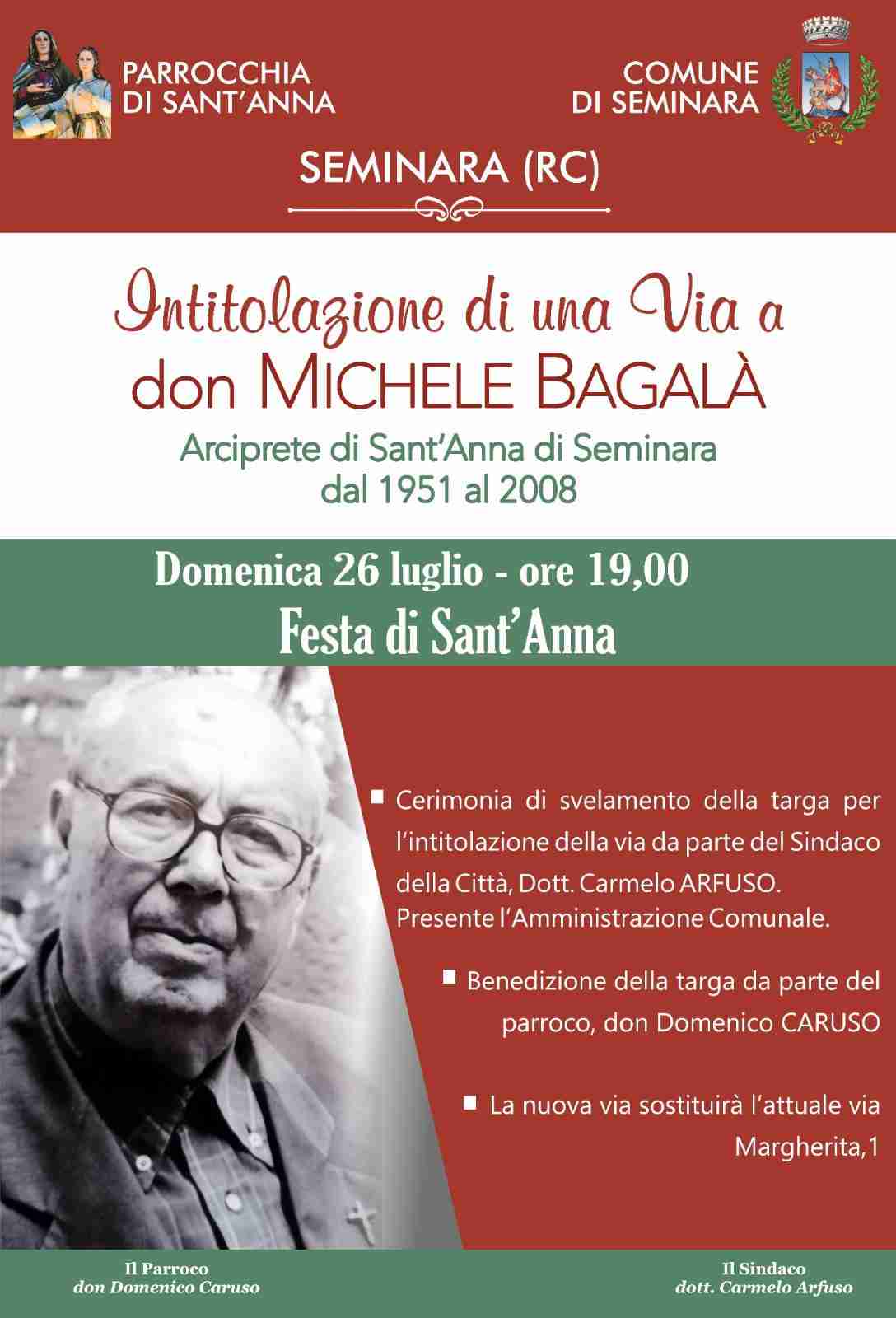 Domenica 26 Luglio, a Sant’Anna di Seminara, si svolgerà la cerimonia di svelamento della targa per l’intitolazione di una via a don Michele Bagalà, arciprete di Sant’Anna dal 1951 al 2008.
