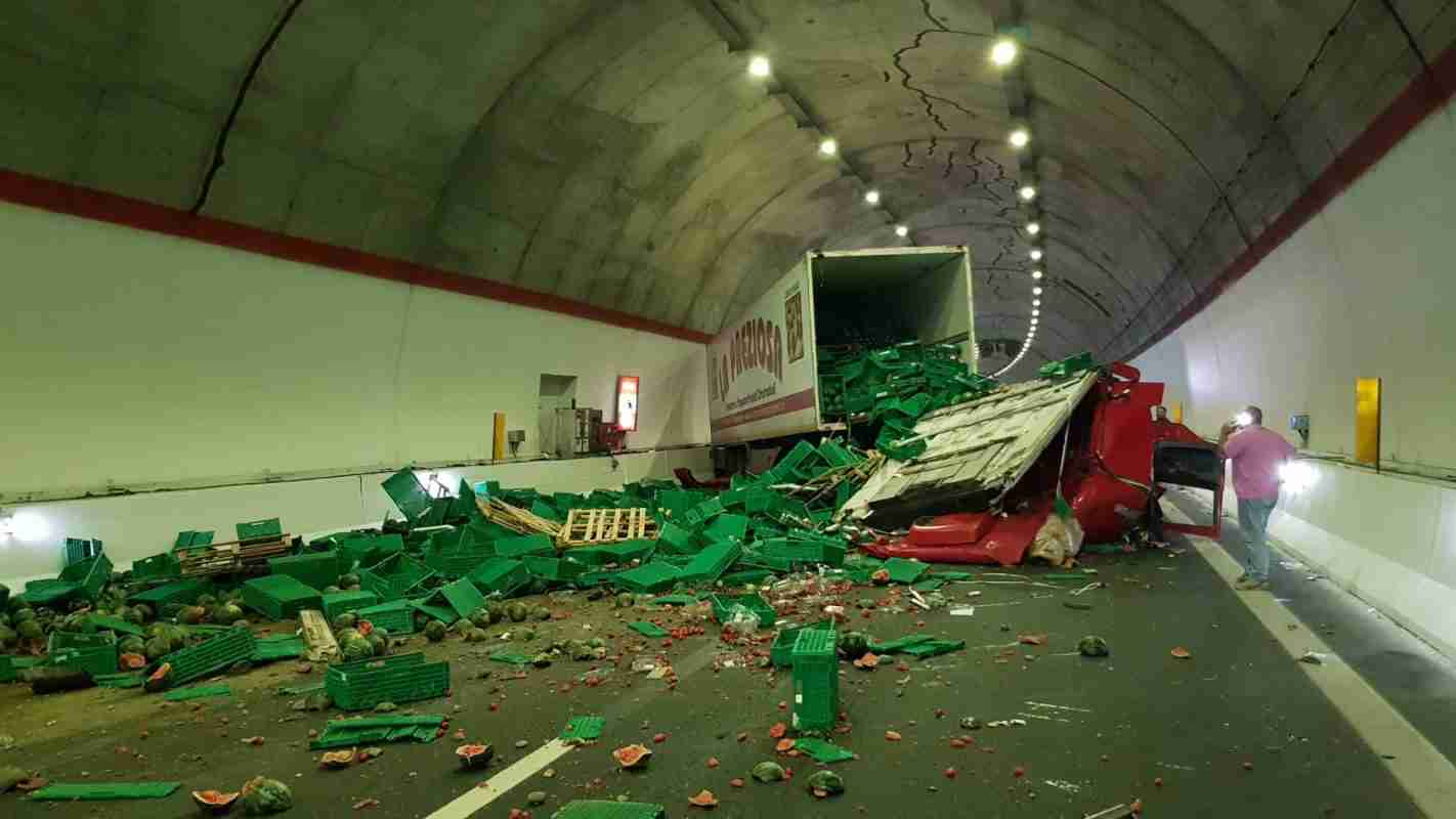 Un camion che trasportava prodotti ortofrutticoli si è ribaltato, perdendo il carico di angurie che ha invaso tutta la carreggiata. Ferito il conducente del mezzo.