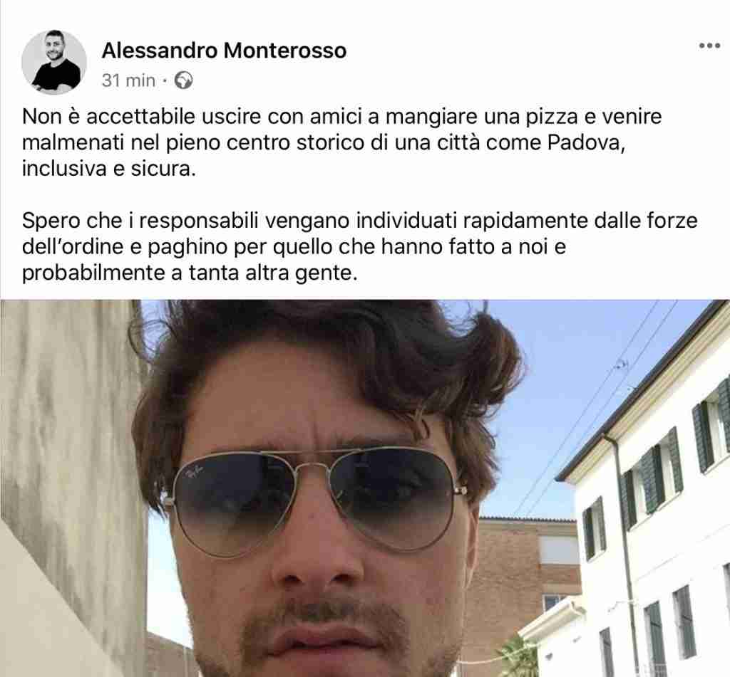 «Non è accettabile uscire con amici a mangiare una pizza e venire malmenati nel pieno centro storico di una città come Padova, inclusiva e sicura – ha commentato Alessandro Monterosso su Facebook – Spero che i responsabili vengano individuati rapidamente dalle forze dell’ordine e paghino per quello che hanno fatto a noi e probabilmente a tanta altra gente».