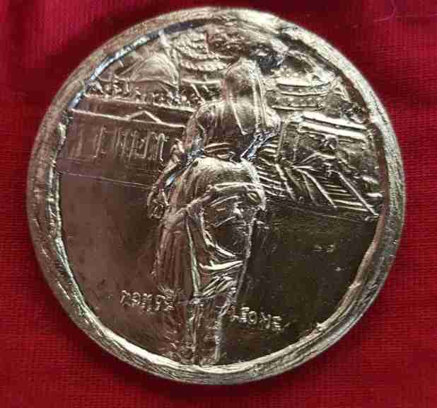 Coniata dallo scultore Alessandro Monteleone, raffigura la tipica “pacchiana” che con la cesta in testa piena di ricordi lascia il suo paese natio (a destra) per andare a Roma (S.Pietro a sinistra). Monteleone in questa medaglia ha scolpito l’eterna ferita del calabrese che ha spesso dovuto lasciare la sua casa in Calabria per bisogno e per trovare certezza di vita altrove, nel mondo.