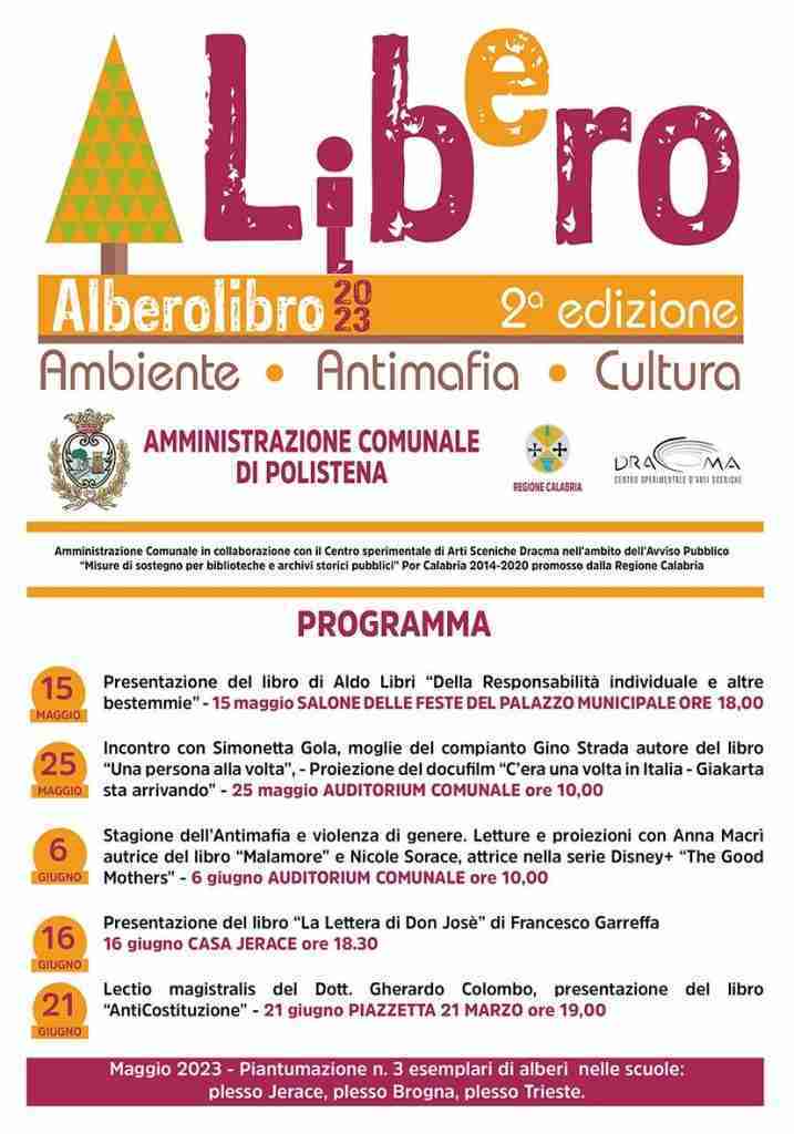 In Auditorium Comunale il 6 giugno alle ore 10 saranno alternate letture e proiezioni con Anna Macri autrice del libro “Malamore” e Nicole Sorace, attrice nella serie Disney+ “The Good Mothers” che narra le vicende di Giusy Pesce, Cetta Cacciola, Lea Garofalo. Il 16 giugno a Casa Jerace alle ore 18.30 sarà presentato il romanzo “La Lettera di Don Josè” con l’autore Francesco Garreffa. Infine il 21 giugno alle ore 19.00 a Piazzetta 21 marzo ALBEROLIBRO 2023 si chiuderà con la “Lectio magistralis” sulla Costituzione del Dott. Gherardo Colombo ex magistrato del pool di Mani Pulite autOre del libro “AntiCostituzione”.