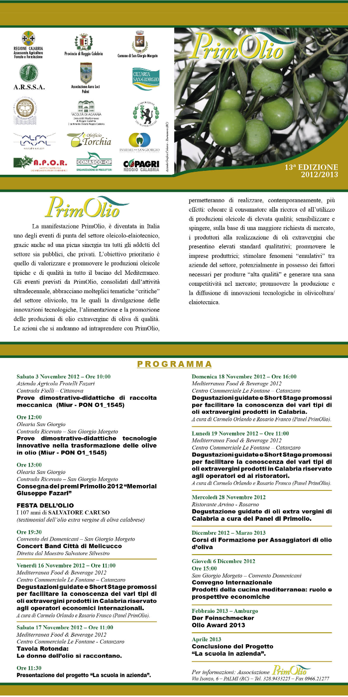 La serie di manifestazioni programmate (guarda la locandina) da PrimOlio e dedicate all’oro verde di Calabria, prenderanno il via il 3 novembre prossimi tra Cittanova e San Giorgio Morgeto, in provincia di Reggio Calabria.