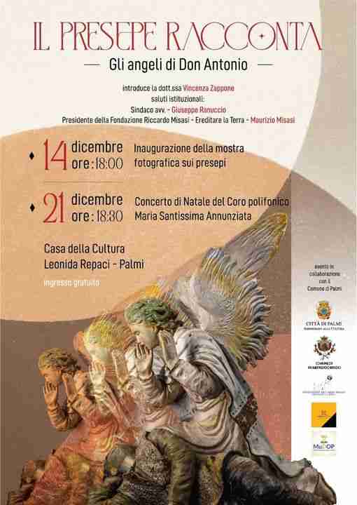 La mostra fotografica sui presepi, con gli scatti di Diego Mazzei, sarà inaugurata il 14 dicembre alle ore 18 e potrà essere visitata per tutto il periodo festivo; inoltre il 21 dicembre alle ore 18.30 si terrà un concerto di Natale del Coro Polifonico Maria Santissima Annunziata durante il quale saranno cantati tre pastorali proprio di Don Antonio Rotondo, artista completo.