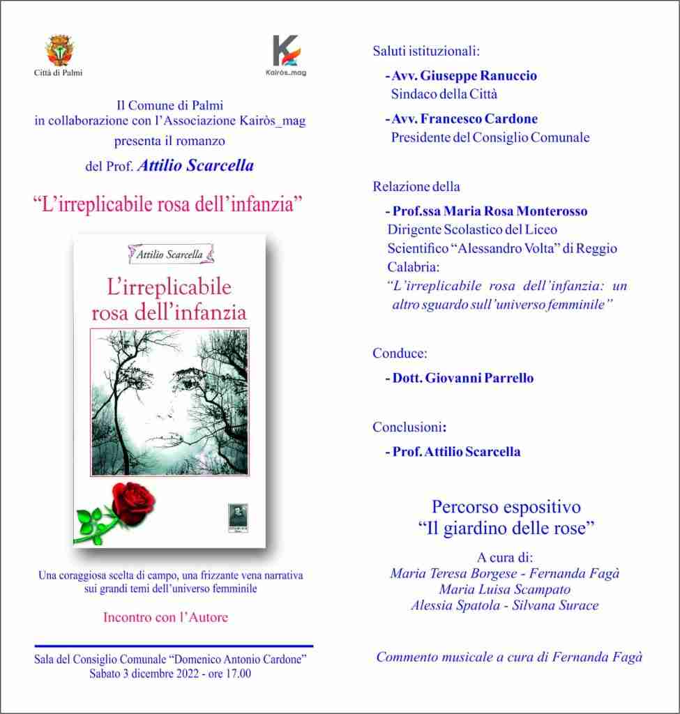 Un romanzo sull’emancipazione femminile, che verrà presentato attraverso sfumature varie d’arte: “L’irreplicabile rosa dell’infanzia”, il nuovo libro del prof. Attilio Scarcella, aprirà le sue pagine al pubblico sabato 3 dicembre alle 17:00 nella sala consiliare del Comune di Palmi, per un evento realizzato dall’Amministrazione Comunale in collaborazione col gruppo culturale Kairòs_Mag.