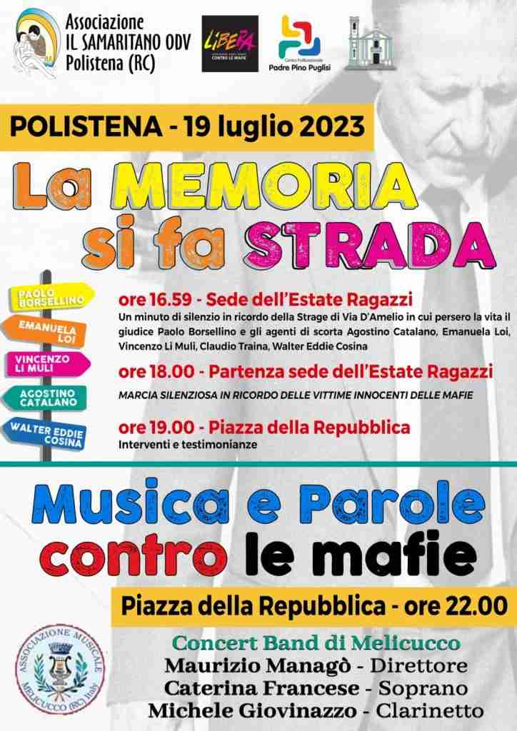 Estate Ragazzi è anche educazione alla legalità. Nel giorno in cui ricorre l’anniversario della strage di Via D’Amelio dove perirono per mano mafiosa il giudice Paolo Borsellino e gli agenti della scorta Agostino Catalano, Vincenzo Li Muli, Claudio Traina, Walter Eddie Cosina ed Emanuela Loi, anche quest’anno, La memoria si fa strada. Nell’ambito del percorso educativo i ragazzi del campus estivo hanno individuato, andando sul luogo, le strade di Polistena intitolate alle vittime innocenti delle mafie e facendo una ricerca sulla vita di ogni singola vittima costruendo anche un albero ai cui rami saranno applicate le foglie colorate con il nome delle vittime delle mafie. Oggi, all’ora esatta dell’attentato, le 16.59, sarà osservato un minuto di silenzio presso la sede dell’Estate Ragazzi mentre alle 18.00 si inizierà una marcia silenziosa che partendo proprio dalla scuola Jerace si concluderà in Piazza della Repubblica, con gli interventi delle autorità ed alcune testimonianze.  Alle 22.00, sempre in piazza della Repubblica avrà luogo l’iniziativa Musica e Parole contro le mafie con il Concerto della Concert Band di Melicucco, diretta dal maestro Maurizio Managò e con la partecipazione di Caterina Francese, soprano e di Michele Giovinazzo, clarinetto. «Queste iniziative non vogliono essere un mero ricordo né commemorazione ma memoria, per fare nostro un testimone che deve vedere bambini e adulti, giovani e meno giovani sempre più coinvolti e non spettatori, nella costruzione di una società senza mafie» ha spiegato il parroco e referente di Libera, don Pino Demasi.