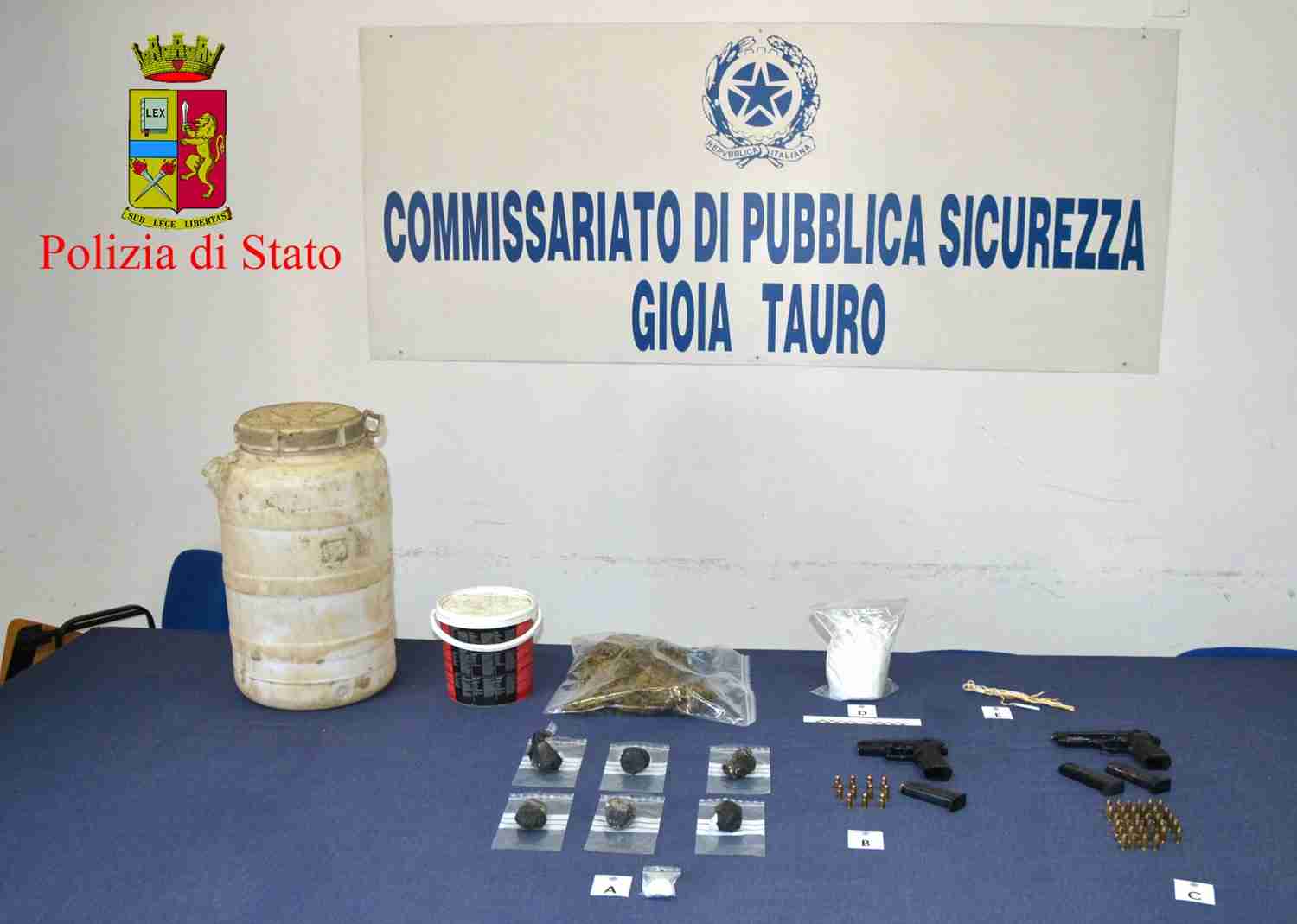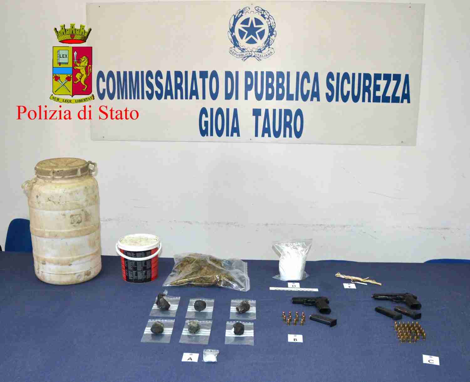 Hanno capito che si trattava di un punto di riferimento e hanno iniziato a scavare trovando, perfettamente occultati sotto terra, diversi contenitori in plastica con all’interno 2 pistole, entrambe con matricola abrasa, 3 caricatori riforniti di cartucce, 45 cartucce, 1 detonatore con cavetto ed un cospicuo quantitativo di cocaina e di cannabis.