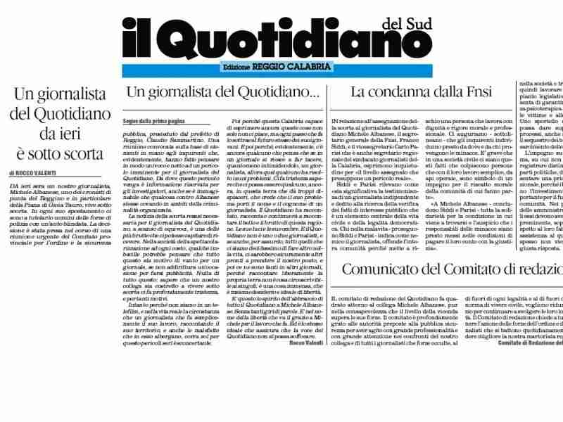Il direttore del Quotidiano del Sud Rocco Valenti ha reso nota la vicenda con un articolo. «Sapere – ha scritto – che un nostro collega sia costretto a vivere sotto scorta ci fa profondamente tristezza e per tanti motivi. Intanto perché nella vita reale la circostanza che un giornalista che fa semplicemente il suo lavoro, raccontando il suo territorio e anche le malefatte che in esso albergano, corra sol per questo pericoli seri è sconcertante. Poi perché questa Calabria capace di esprimere ancora queste cose non solo non ci piace, ma ogni passo che fa lo sottrae al futuro stesso dei suoi giovani. E poi perché, evidentemente, c’è ancora qualcuno che pensa che se in un giornale si riesce a far tacere un giornalista, allora quel qualcuno avrà risolto i suoi problemi».