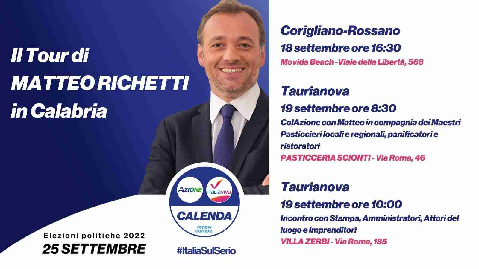 Domenica 18 e lunedì 19 settembre sarà in Calabria il Sen. Matteo Richetti, presidente nazionale di Azione, per sostenere i candidati e incontrare simpatizzanti ed elettori in vista del voto di domenica 25 settembre. Matteo Richetti, fondatore di Azione assieme al leader Carlo Calenda, domenica 18 settembre sarà prima a Crotone per un incontro informale con imprenditori del luogo e poi a Corigliano-Rossano (Cs) alle ore 16.30 per un incontro pubblico al Movida Beach (Viale della Libertà, 568) infine nella giornata di Lunedì sarà a Taurianova (Rc) per due incontri, città a cui legato per l’amicizia con Fabio Scionti, segretario regionale di Azione e capolista in Calabria al Senato.