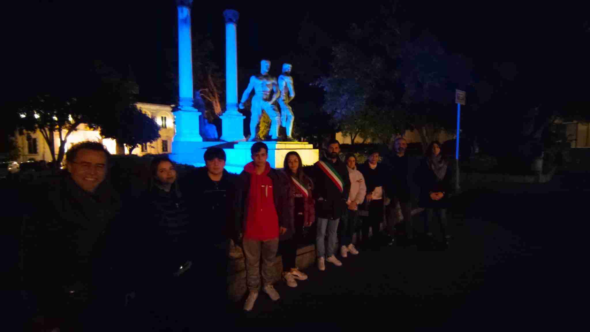 Piccoli gesti simbolici: le strisce pedonali all’ingresso della città che si tingono di blu e giallo, i colori della bandiera dell’Ucraina; il monumento ai Caduti illuminato con gli stessi colori.