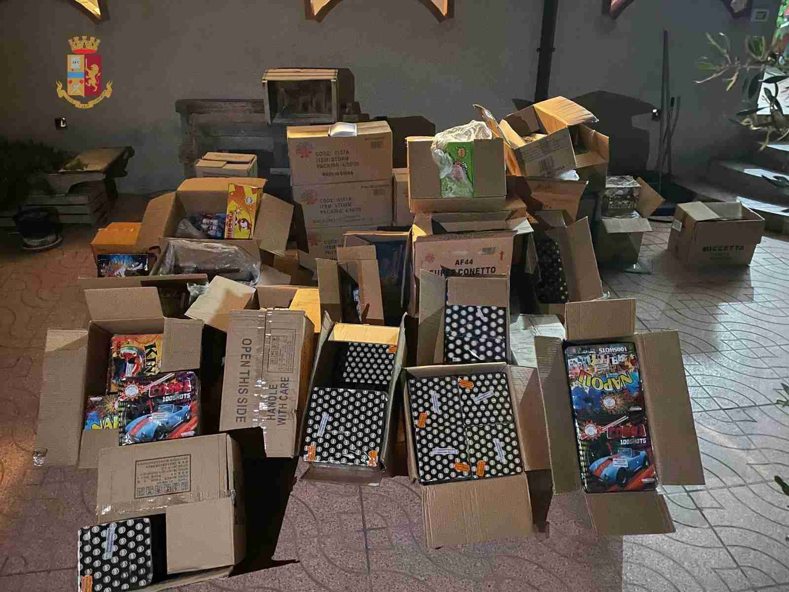 Al primo piano il personale del Commissariato di Condofuri ha rinvenuto 42 scatoloni di cartone contenenti 41 kg. di carica esplosiva, giochi pirotecnici, provvisti di marcatura CE, la cui autenticità è in corso si accertamento, del tipo F2 categoria V gruppo D.