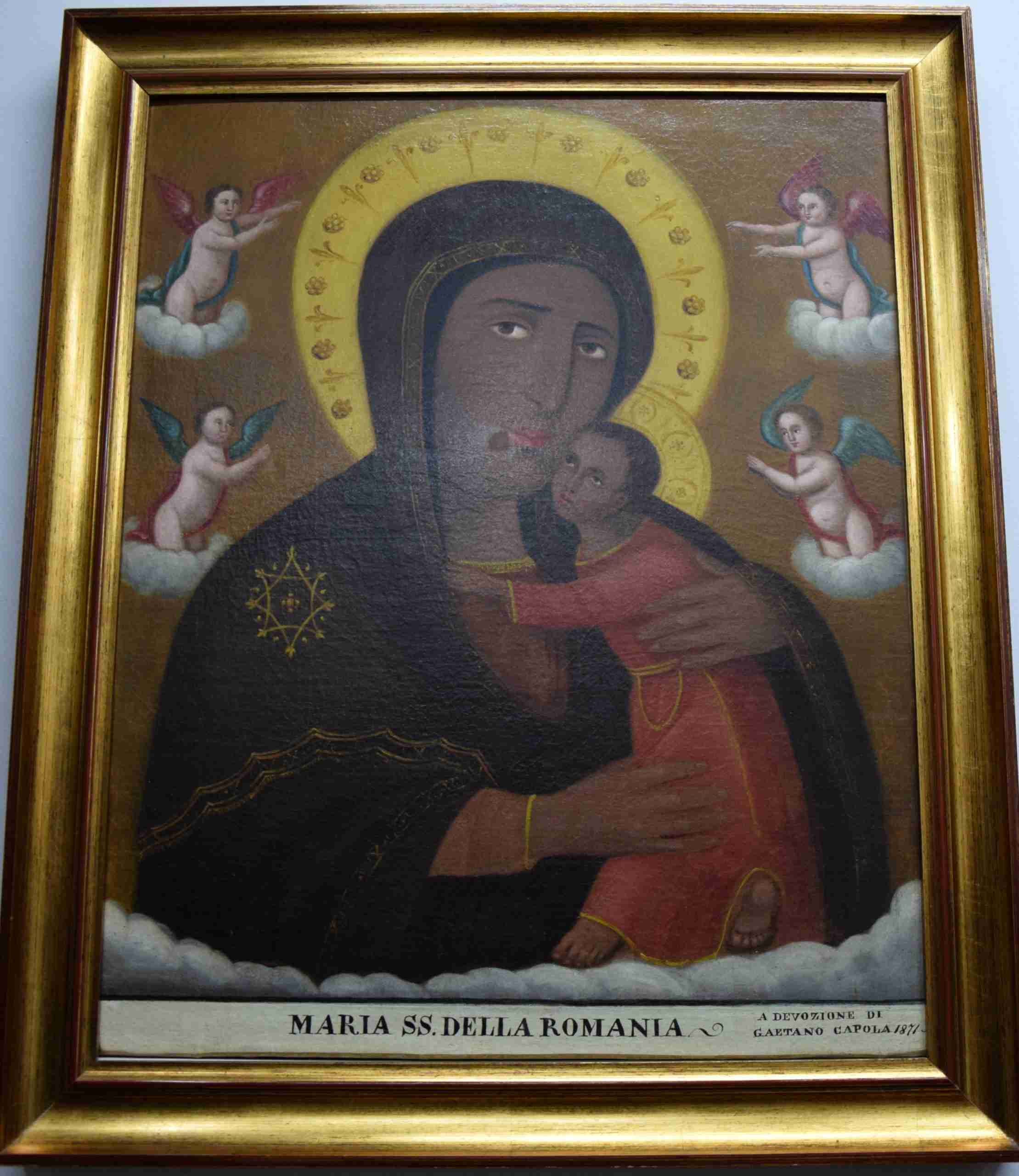 La correlazione più vicina è la “Madonna di Romania”, dal greco “Pωμάνια”, Terra dei Romei, venerata a Tropea. Una icona bizantina rimaneggiata, una copia della quale è computata nell’Inventario redatto in occasione della visita pastorale di Mons. Antonio Maria De Lorenzo, vescovo di Mileto, alla Parrocchia di Gioja nel 1891 che rileva “un quadro della Vergine di Romania” e inseguito disperso.