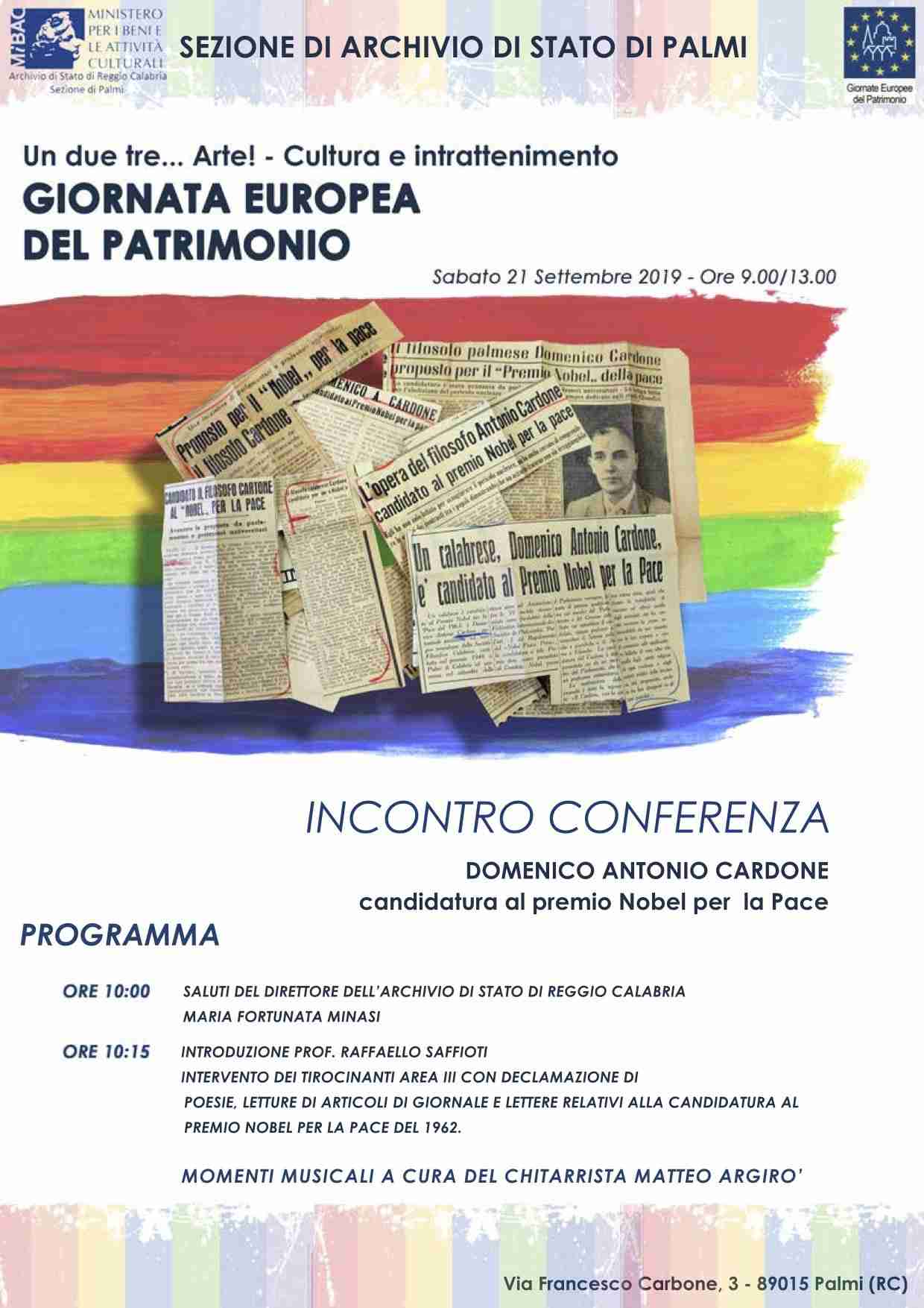 In occasione delle Giornate Europee del Patrimonio 2019, promosse dal Consiglio d’Europa e dalla Commissione Europea dal 1991, la Sezione di Archivio di Stato di Palmi aderisce alla manifestazione con un’apertura straordinaria sabato 21 settembre dalle ore 9.00 alle ore 13.00. Quest’anno le giornate sono incentrate sul tema “Un, Due, Tre… Arte! – Cultura e intrattenimento”.