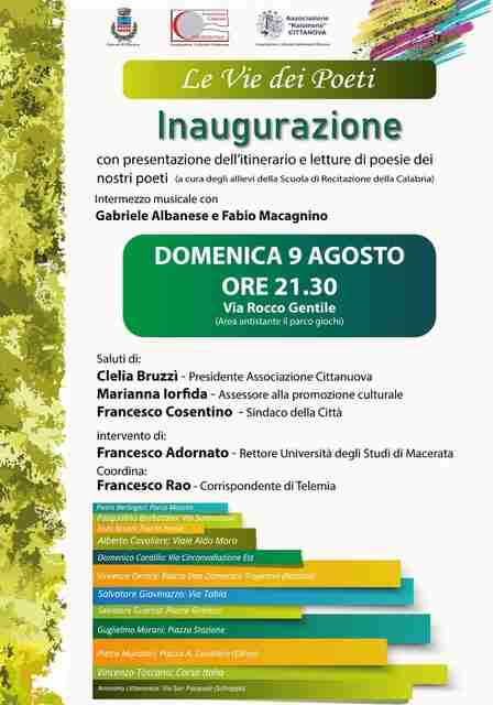 Questi due elementi, vita del poeta e riconducibilità specifica di un luogo, divengono un modello di straordinaria elevazione culturale destinati ad essere collocati nel progetto promosso dall’Amministrazione Comunale e teso a rendere Cittanova un Museo a cielo aperto. Durante il corso della serata, sono previsti intermezzi musicali a cura di Gabriele Albanese e Fabio Macagnino. Inoltre, grazie alla partecipazione degli allievi della Scuola di Recitazione della Calabria, saranno interpretate alcune poesie redatte dai nostri poeti. Sono previsti i saluti della Presidente dell’Associazione Cittanuova Clelia Bruzzi; dell’Assessore alla promozione culturale Marianna Iorfida. Seguiranno gli interventi del Sindaco del Comune di Cittanova Francesco Cosentino e di Francesco Adornato, Rettore dell’Università degli Studi di Macerata.