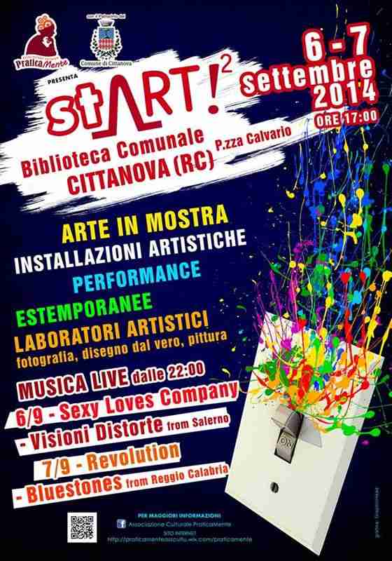 Settembre è arrivato e con lui anche la seconda edizione di StArt!, che è “cresciuto ad Arte” esponenzialmente: sabato 6 e domenica 7 l’Associazione PraticaMente sarà vetrina per il Comune di Cittanova, che patrocina StArt!² e regalerà la possibilità di godere di opere (che saranno esposte il 6 dalle ore 17.00 alle ore 22.00 ed il 7 dalle ore 16.00 alle ore 22.00) partorite dall’estro creativo di stArtisti di grosso calibro, fra i quali Corbara: stArtista e performer poliedrico e polivalente, Giovanni Zungri, che realizza dipinti a trompe-l’œil ed iperrealistici, il collettivo Zazzamita (“zazzamita” è il termine dialettale siciliano per “geco”), la band Visioni Distorte, dalla cui ricerca di una propria identità personale nasce una “strana” commistione fra funky, rock, hip hop e musica elettronica definita “Hip-Rock” e la band post-grunge dei Bluestones: social makers, con la loro “Broken Mirror”, per ReActionCity RC 2014: progetto di innovazione sociale urbana.