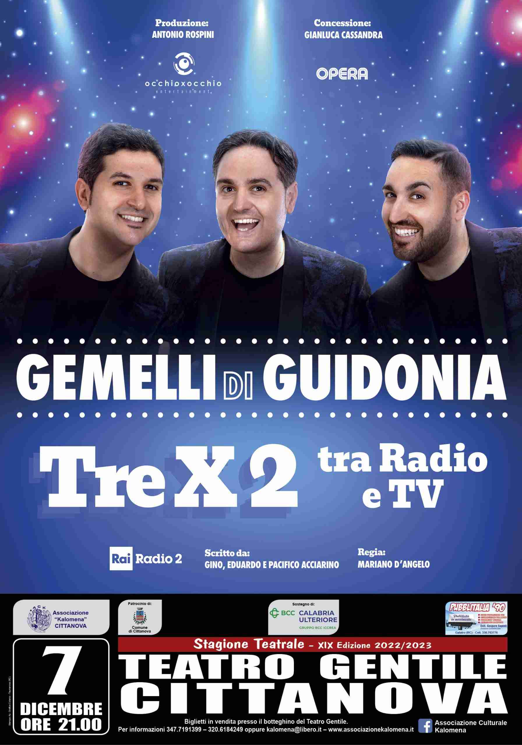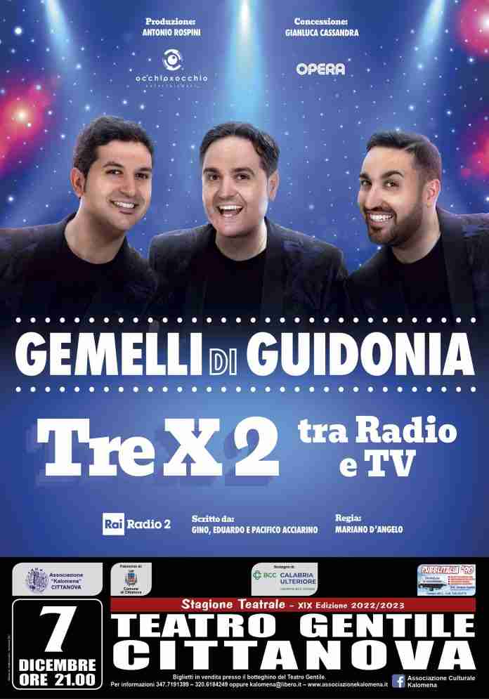 Cresce l’attesa per l’inizio della nuova Stagione Teatrale di Cittanova. Saranno i Gemelli di Guidonia con il divertente spettacolo “Tre X 2 tra Radio e TV”, unica tappa calabrese del loro tour, ad inaugurare mercoledì 7 dicembre la XIX Rassegna 2022/23 al Teatro Gentile.