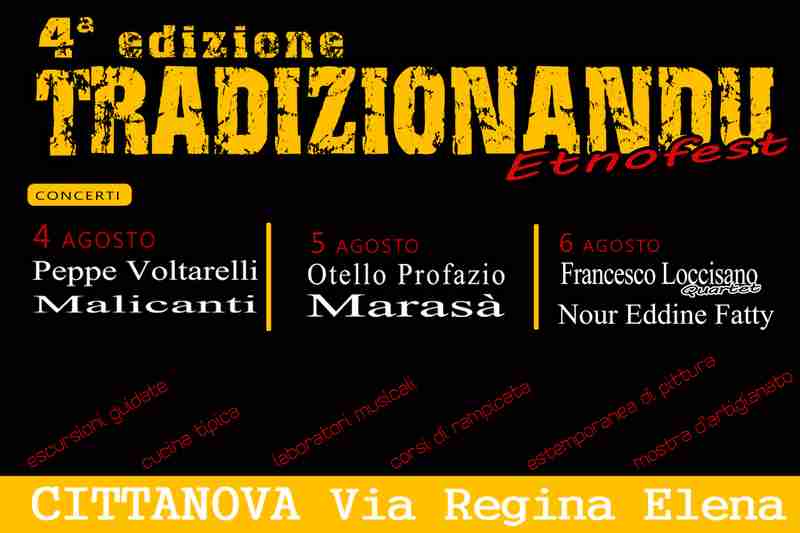 L’associazione musico-culturale Lato 2, con sede a Cittanova, presenta la 4° edizione dell’Etnofestival “Tradizionandu”, rassegna musicale all’insegna della tradizione e della cultura popolare che, con una formula ormai consolidata e di successo, coinvolgerà nell’arco delle tre serate del 4-5-6 agosto esponenti di spicco del panorama musicale popolare provenienti da tutto il Sud d’Italia e, da quest’anno, volendo allargare il proprio orizzonte a una visione euro-mediterranea, anche dall’area nord-africana.