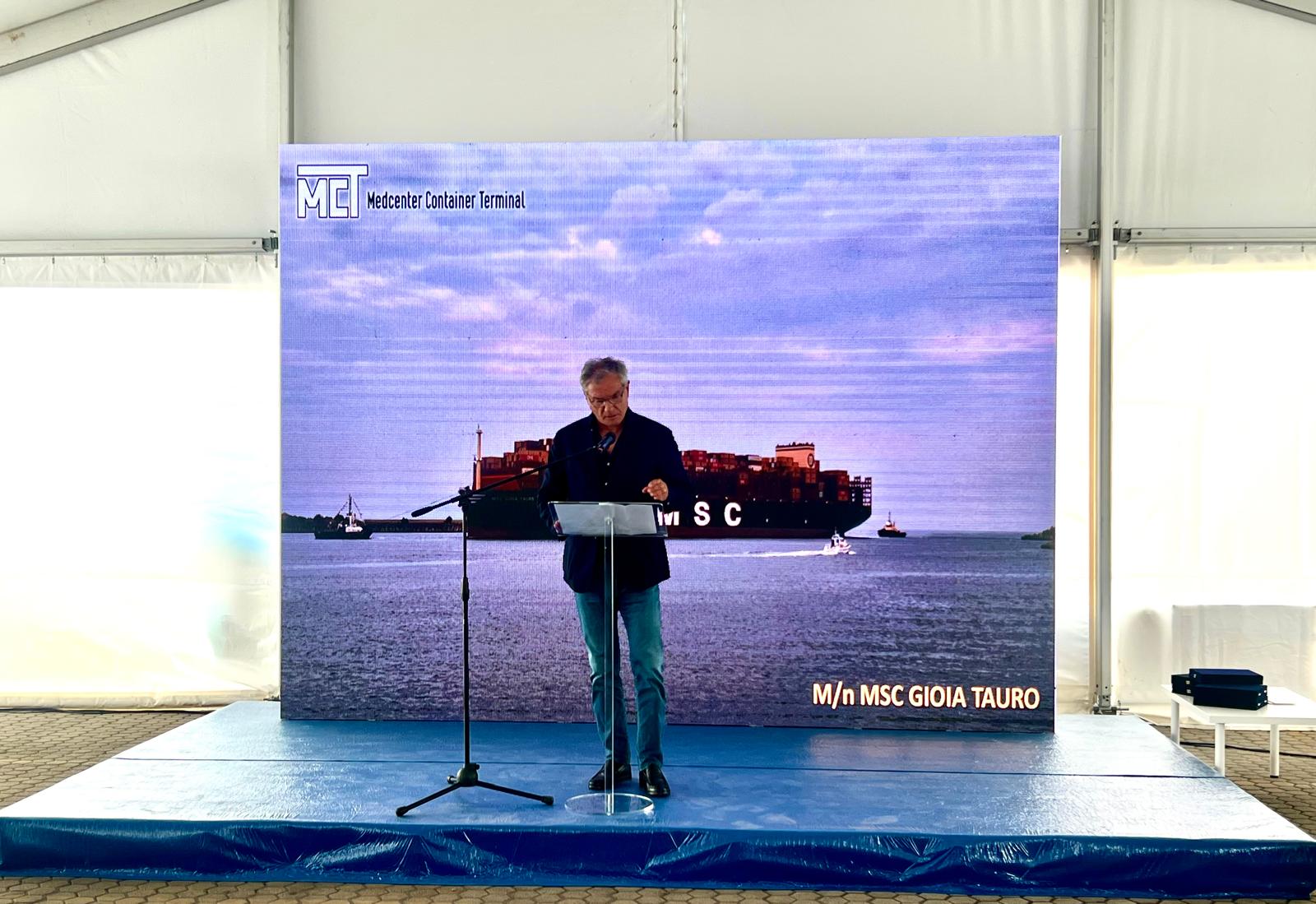 Andrea Agostinelli, nel corso della cerimonia del battesimo commerciale della portacontainer