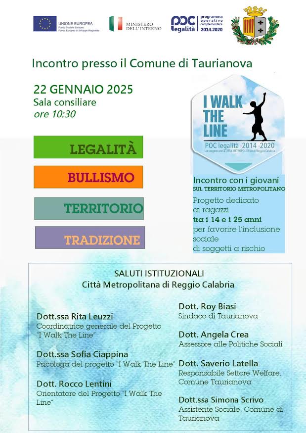 Domani, mercoledì 22 gennaio 2025, nella sala consiliare del Comune di Taurianova sarà teatro della 4° tappa della campagna di presentazione itinerante del progetto “I walk the line”, che, curato dalla città metropolitana di Reggio Calabria, ha fra i suoi partner  anche l’amministrazione guidata dal sindaco Roy Biasi.