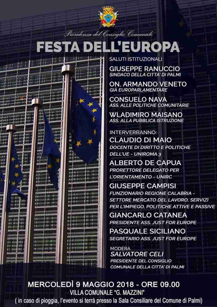 Il sindaco Ranuccio dichiara: “Dopo oltre un lustro, a Palmi si torna a celebrare la “Festa dell’Europa”, sintomo di come questa Amministrazione pone al centro della propria azione amministrativa i principi dell’Unione. La tematica di quest’anno sarà “I Giovani e l’Europa”, dove i protagonisti saranno i ragazzi”.