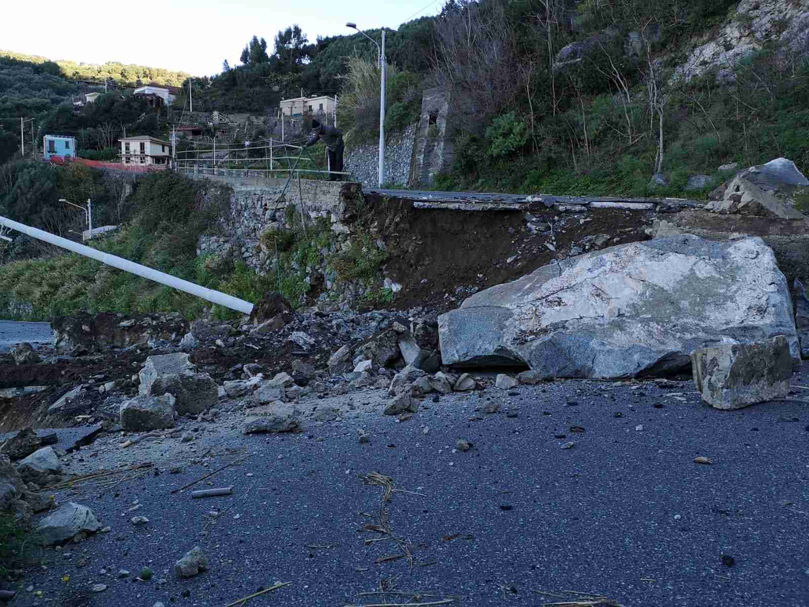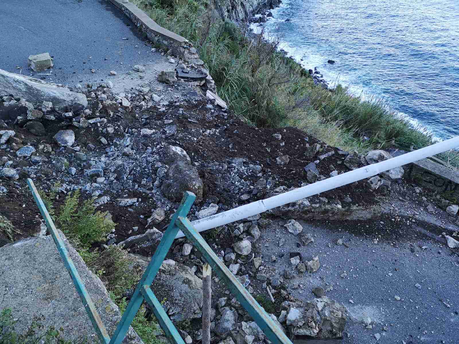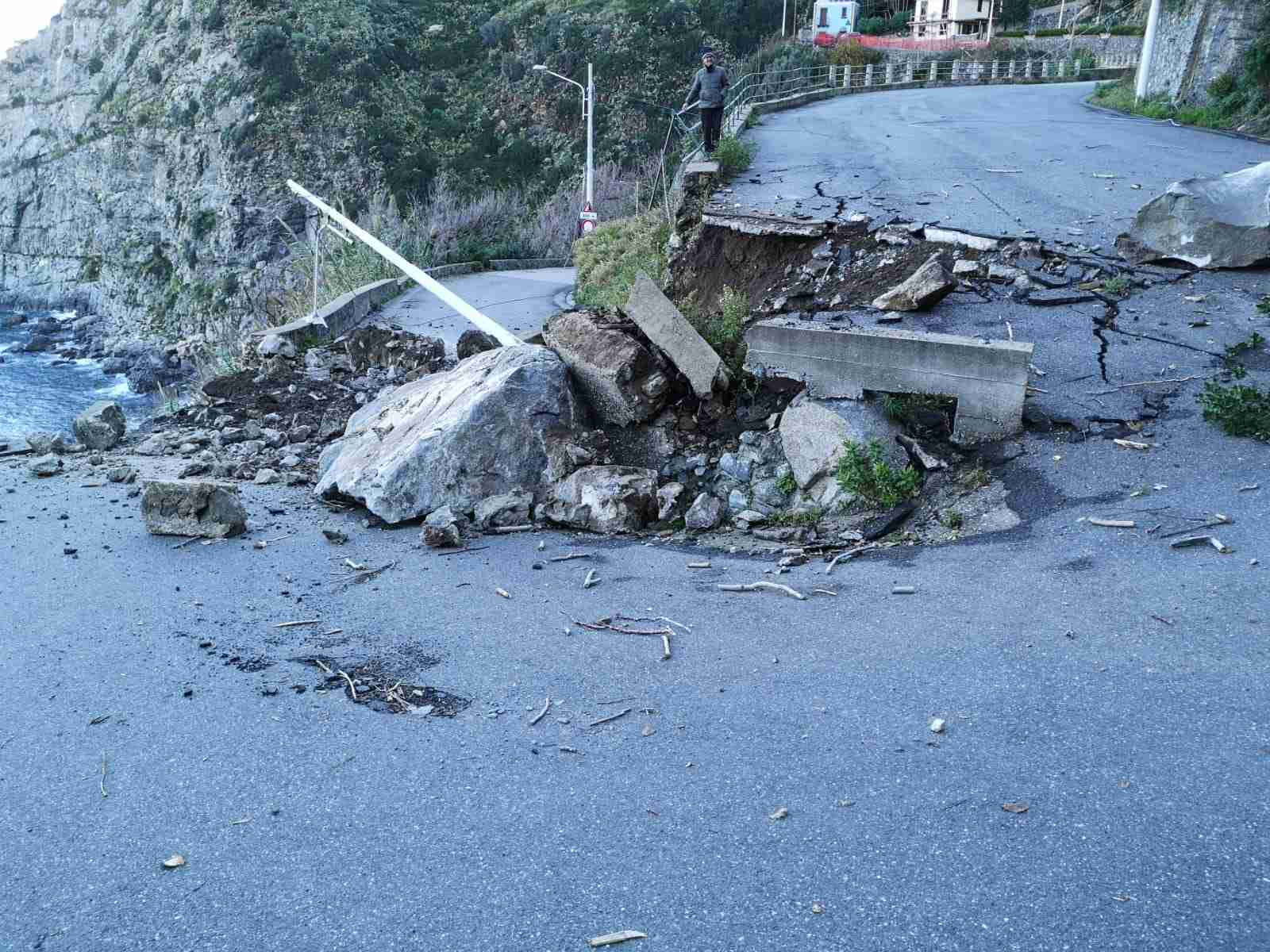 Buona parte della strada è andata distrutta; nel crollo ha ceduto anche un lampione della luce pubblica, e diversi altri massi sono caduti fin sulla spiaggia.
