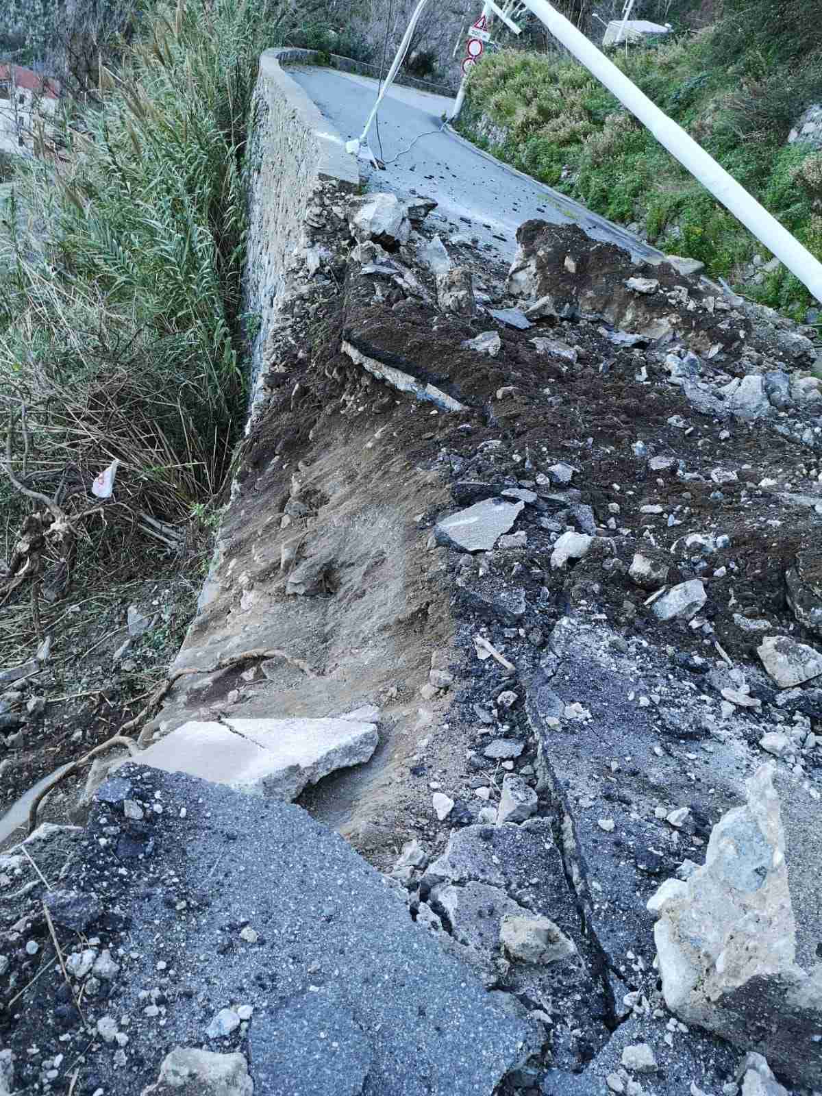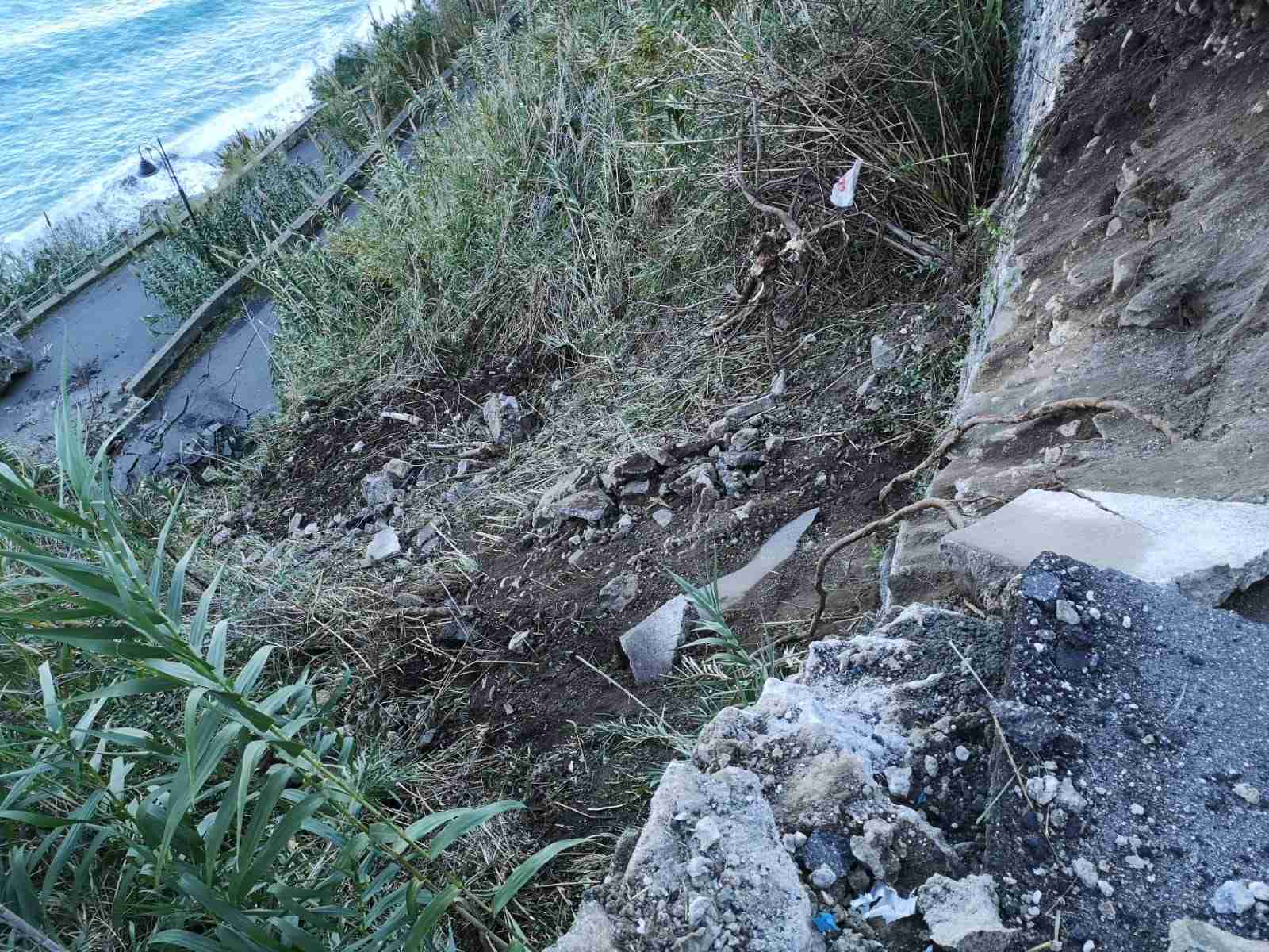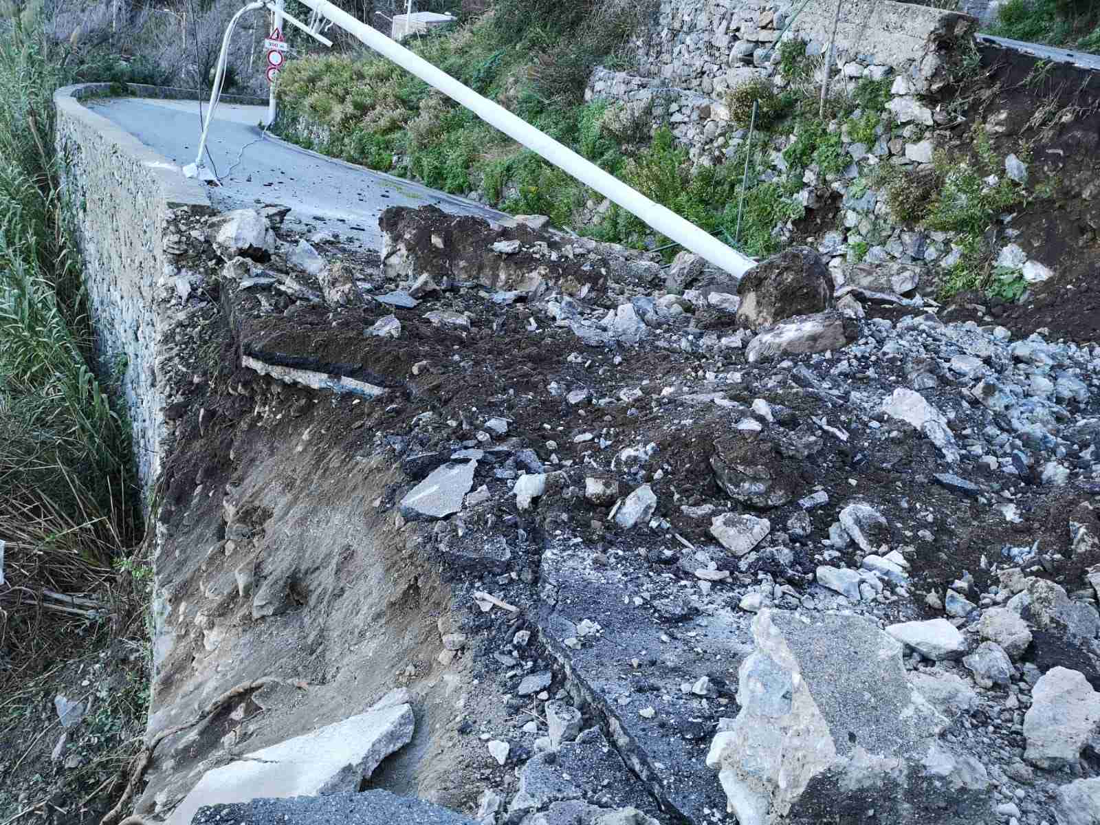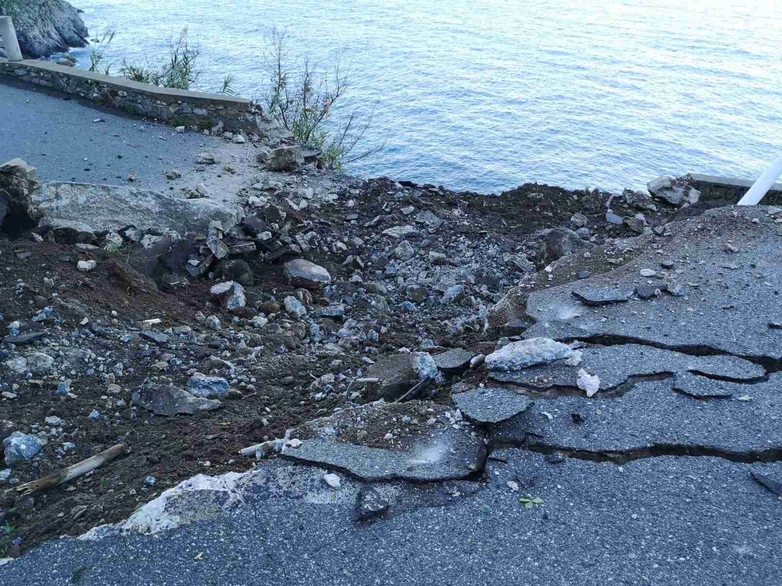 Buona parte della strada è andata distrutta; nel crollo ha ceduto anche un lampione della luce pubblica, e diversi altri massi sono caduti fin sulla spiaggia.