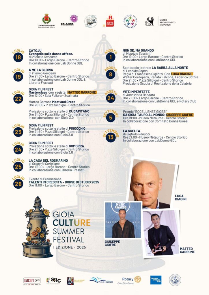 Il programma prevede reading e presentazioni con autori di rilievo, proiezioni sotto le stelle dei film più amati del cinema italiano, una masterclass esclusiva con il regista 𝐌𝐚𝐭𝐭𝐞𝐨 𝐆𝐚𝐫𝐫��𝐧𝐞, vincitore di numerosi premi internazionali, e spettacoli teatrali con la partecipazione del celebre attore 𝐋𝐮𝐜𝐚 𝐁𝐢𝐚𝐠𝐢𝐧𝐢. A coronare l’estate culturale, il 5 settembre il Museo Metauros ospiterà l’evento di premiazione “Eccellenze Gioiesi – Da Gioia Tauro al Mondo”, che vedrà protagonista il ballerino di fama mondiale 𝐆𝐢𝐮𝐬𝐞𝐩𝐩𝐞 𝐆𝐢𝐨𝐟𝐫𝐞̀, orgoglio della città e talento riconosciuto a livello internazionale.