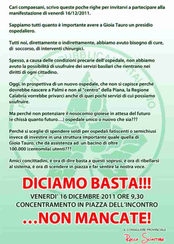 In un manifesto il sindaco e i consiglieri comunali hanno riassunto i principali motivi della manifestazione. «I cittadini di Gioia Tauro parteciperanno – hanno scritto – per dire no alla chiusura di fatto dell’Ospedale Giovanni XXIII di Gioia Tauro; – per dire no al suo depotenziamento con la chiusura di reparti chiave ed indispensabili per la sua stessa sopravvivenza; per dire no a questo disegno politico perverso di sanità pubblica inefficace e inefficiente che vuole annullare la sanità nella città di Gioia Tauro dopo averle imposto inceneritori, rigassificatori e depuratori».