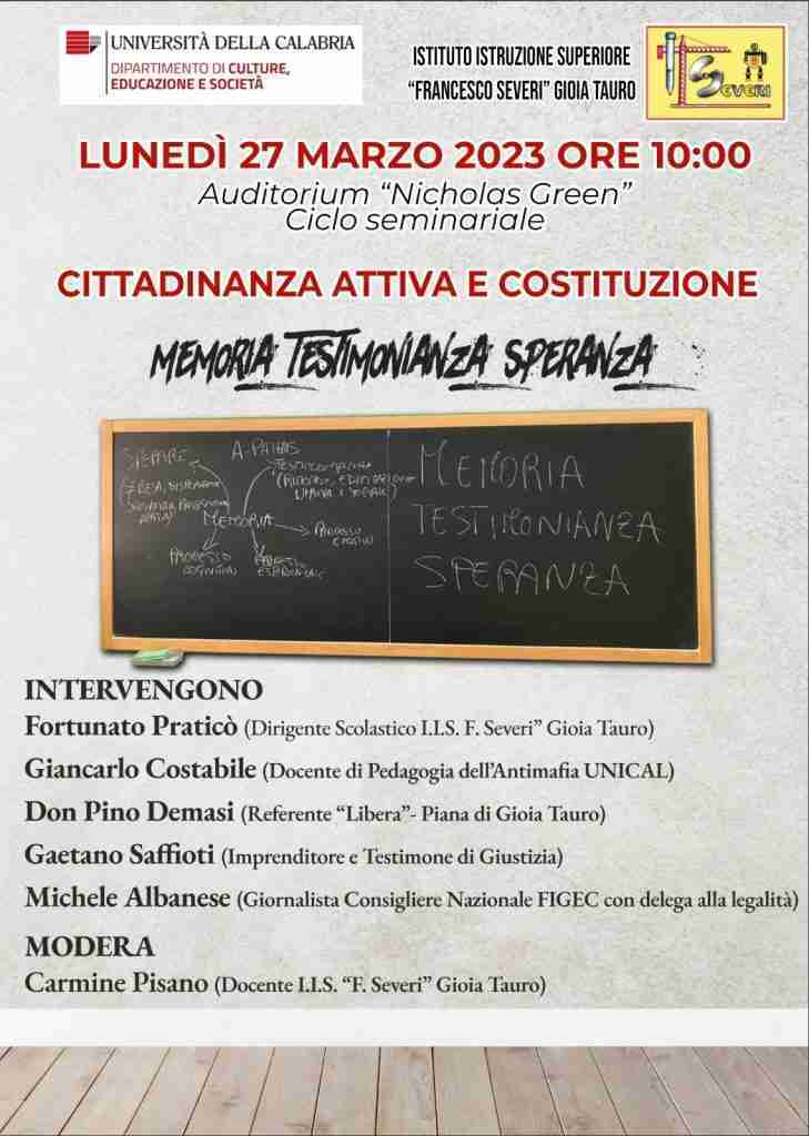 In coincidenza con la settimana commemorativa delle vittime innocenti delle mafie e in prosecuzione del ciclo di incontri che ha preso avvio il 24 febbraio scorso in parthnership con il Prof. Giancarlo Costabile dell’Università della Calabria, l’Istituto F. Severi di Gioia Tauro, diretto dal Prof. Fortunato Praticò, comunica la prossima data del 27 marzo in cui gli alunni delle classi quinte saranno impegnati in un seminario sul tema della memoria, testimonianza e speranza, organizzato in collaborazione con la referente della disciplina di ed civica Prof.ssa Domenica Velardo, la Prof.ssa Rossella Bulsei e moderato dal Prof. Carmine Pisano.