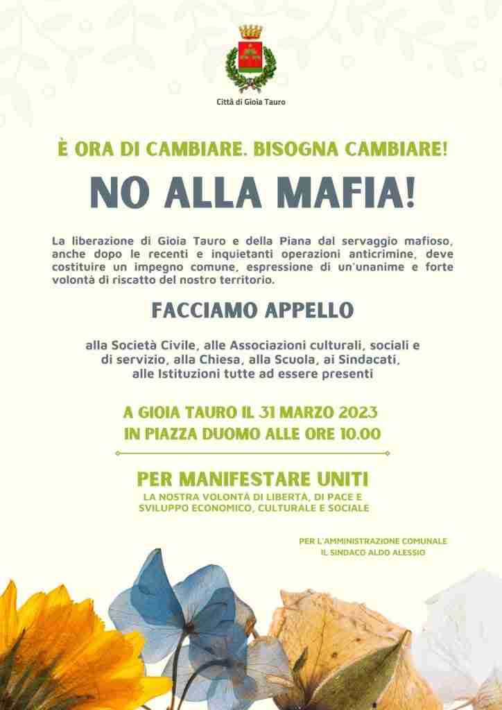 «Il mio è un appello accorato e forte alla Città di Gioia Tauro, al Popolo della Piana, della Provincia reggina e della Calabria tutta. Un appello ad essere uniti, convinti, fiduciosi e liberi contro la Mafia». A scriverlo in una nota è Aldo Alessio, sindaco di Gioia Tauro, presentando una manifestazione contro la criminalità organizzata che si terrà domani, venerdì 31 marzo, alle ore 10:00 in Piazza Duomo a Gioia Tauro.