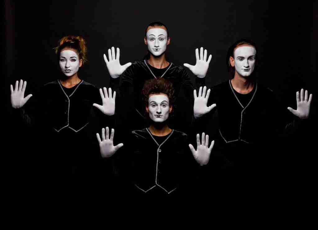 Quattro figure vestite di nero e truccate di bianco entrano in una scena vuota e col solo uso del corpo la riempiono, facendo prendere vita a personaggi e situazioni dalle più fantasiose alle più ordinarie, tutte descritte con precisione stupefacente da questi virtuosi dell’espressione fisica.