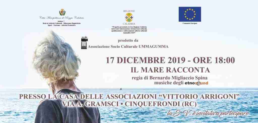 Martedì 17 dicembre, alle ore 18.00, nella Casa delle associazioni “Vittorio Arrigoni”, in via Gramsci, a Cinquefrondi (RC), sarà proiettato “Il mare racconta”, docu-film firmato da Bernardo Migliaccio Spina e prodotto dall’associazione socio-culturale “Ummagumma” presieduta da Biagio Milano.
