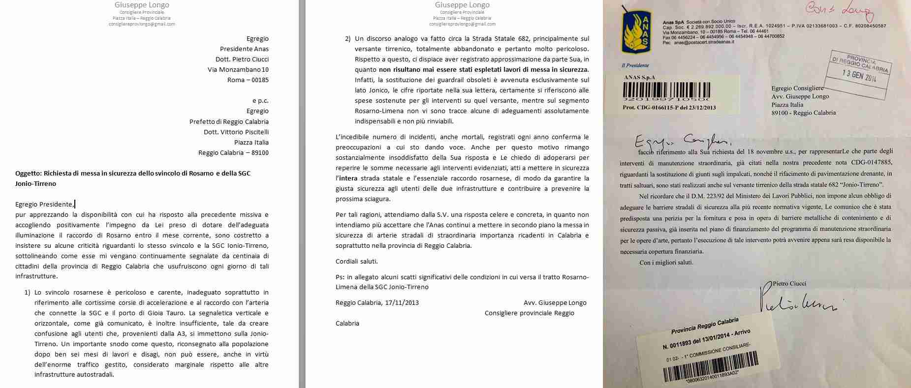 Dopo due mesi, il Presidente dell’Anas Pietro Ciucci mi risponde alla missiva del 18 novembre u.s. e, pur ammettendo l’esistenza di barriere stradali di sicurezza “non adeguate alla più recente normativa vigente” sulla SS682 Jonio-Tirreno, comunica formalmente (citando il D.M. 223/92 del Ministero dei Lavori Pubblici) di non essere obbligato a metterle a norma.