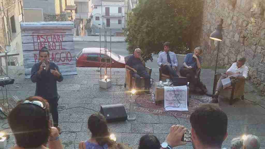 Due cavalletti sporchi di calcestruzzo e una tavola di legno sono stati la seduta, con piedi dondolanti nel vuoto, del Maestro Rocco Cannizzaro: un ingresso inaspettato quanto il brano di Luis Bacalov, “Il postino”, che ha sovrapposto e ritmato l’intervento di Peppe Crea.