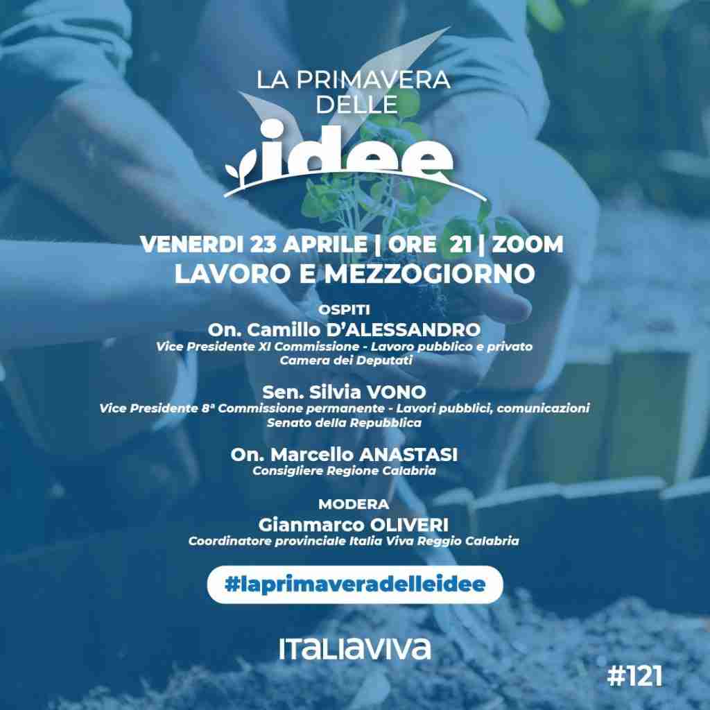 Si è svolto ieri, sulla piattaforma digitale Zoom, il secondo incontro per l’area metropolitana reggina di Primavera delle Idee, l’ormai nota campagna renziana di incontro e confronto tra dirigenza del partito, rappresentanti nelle Istituzioni e tesserati. Al centro del dibattito, il lavoro nel Mezzogiorno, con particolare attenzione alla posizione dei tirocinanti calabresi. All’incontro, fortemente voluto dal coordinatore provinciale Gianmarco Oliveri, hanno preso parte l’on. Camillo D’Alessandro, Vice Presidente della Commissione Lavoro alla Camera dei Deputati, la sen. Silvia Vono, Vice Presidente della Commissione Lavoro al Senato, e l’on. Marcello Anastasi, Consigliere della Regione Calabria, nonché una rappresentanza dei tirocinanti che hanno così avuto modo di dare voce al disagio che, ormai da tempo, vivono a causa di una posizione lavorativa precaria, con insufficienti, spesso inesistenti, riconoscimenti economici, lavorativi e di carriera.