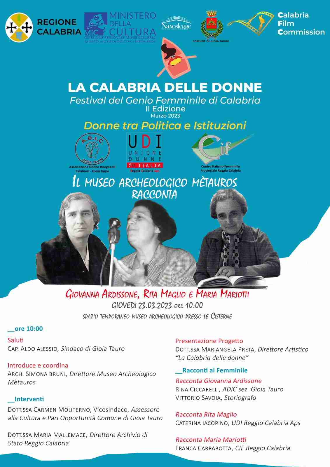L’iniziativa si è svolta all’interno delle manifestazioni del Festival del Genio Femminile di Calabria che quest’anno ha come tema “Donne tra politica e istituzioni” e, per importanza storica, letteraria, pedagogica, politica, sociale, sta avendo diffusione in tutt’Italia con la riproduzione del modello proposto dalla direttrice artistica del Festival “La Calabria delle donne”, Mariangela Preta.