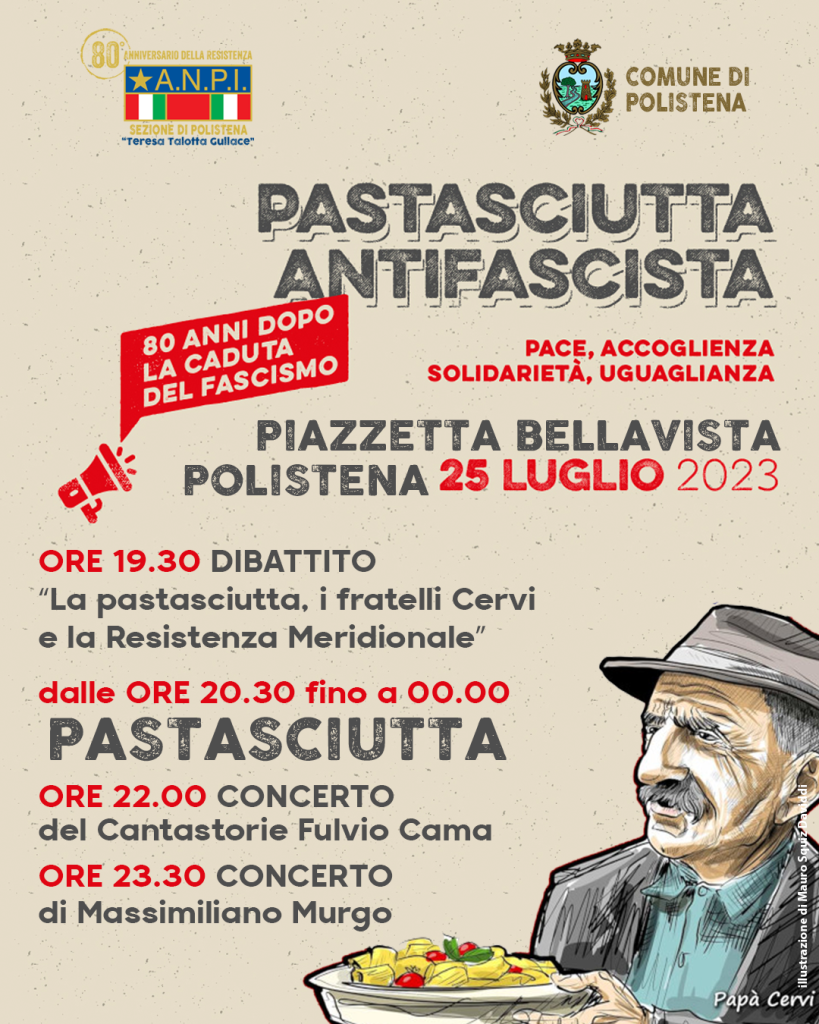 La pastasciutta come segno di riscatto dall’oppressione fascista e come piatto della festa e della condivisione. Si chiama “Pastasciutta antifascista” la manifestazione organizzata domani 25 luglio a Polistena, presso piazzetta Bellavista – prendendo spunto da un aneddoto della famiglia Cervi nel 1943 – dalla locale sezione ANPI “Teresa Talotta Gullace” per un vento che si terrà, in concomitanza, in numerose città italiane. Una serata all’insegna della giovialità, certo, ma nel solco della riflessione antifascista e dei valori ispiratori dell’associazione che prevedranno un dibattito con a tema la liberazione e il contributo dei partigiani meridionali alla lotta di Resistenza a cui prenderanno parte il sindaco della città, Michele Tripodi, Elisabetta Tripodi, Presidente Comitato provinciale ANPI, Francesco Mammola, Presidente sezione ANPI di Polistena, Giorgio Castella, componente Direttivo sezione ANPI di Polistena e del Comitato scientifico provinciale con la testimonianza di un parente di un partigiano locale. “Sarà una serata di degustazione, musica e dibattiti, con stand che raccontano la storia della resistenza e dei fatti di antifascismo locale, della nascita della Costituzione e della conquista della democrazia” hanno tenuto a spiegare gli organizzatori. Al termine del dibattito, cena aperta a tutti a prezzi popolari e, a seguire, buona musica a cura di Fulvio Cama e Massimiliano Murgo.