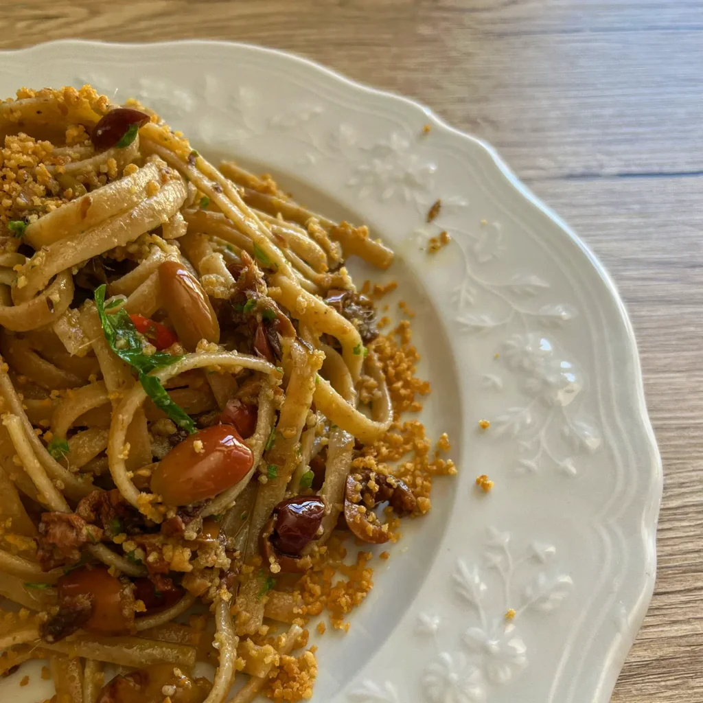 Il sughetto soffritto della struncatura gioiese si fa con olio extra vergine di oliva, alici salate, peperoncino, olive nere denocciolate, spolverata di mollica abbrustolita dopo essere stata versata nel piatto.