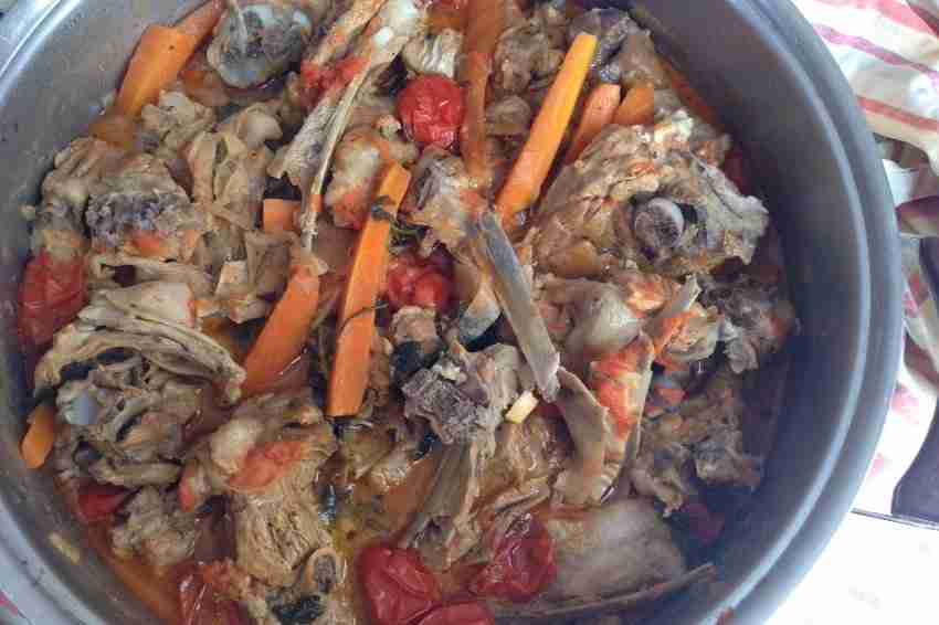 In una padella mettere l’agnello a sfumare solo con il vino bianco e dopo aggiungere il soffritto precedentemente preparato. Sale e pepe. Fare cuocere per circa un’ora.