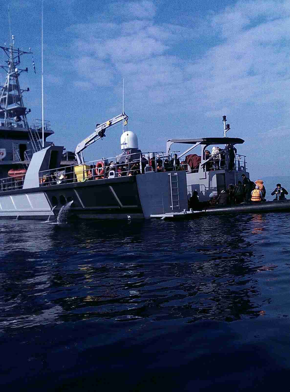 Ci spingiamo fino al confine con le acque territoriali turche: anche oggi il solito balletto della Guardia Costiera di lì, che si palesa solo per mostrare la propria presenza, finge di ostacolare il gommone e poi li lascia finalmente andare, in modo che ci possano raggiungere.