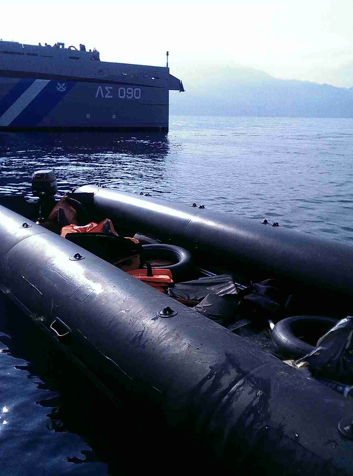 Se non fossi qui mi sembrerebbe di assistere a un film: elicotteri, un’enorme barca, appena arrivata, della Guardia Costiera greca, le barche velocissime di Frontex con le sirene blu spiegate e, all’orizzonte, perfino tre delfini, a rendere tutto surreale.