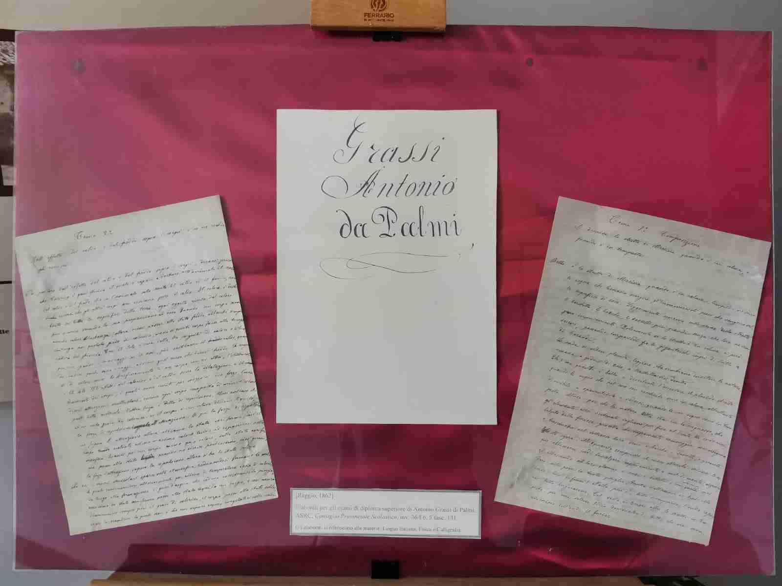 I visitatori hanno potuto apprezzare documenti di vario genere degli anni 1849-1862, quali foto, elaborati per esami di diploma di scuola superiore del palmese Antonio Grassi di lingua italiana, fisica e calligrafia.