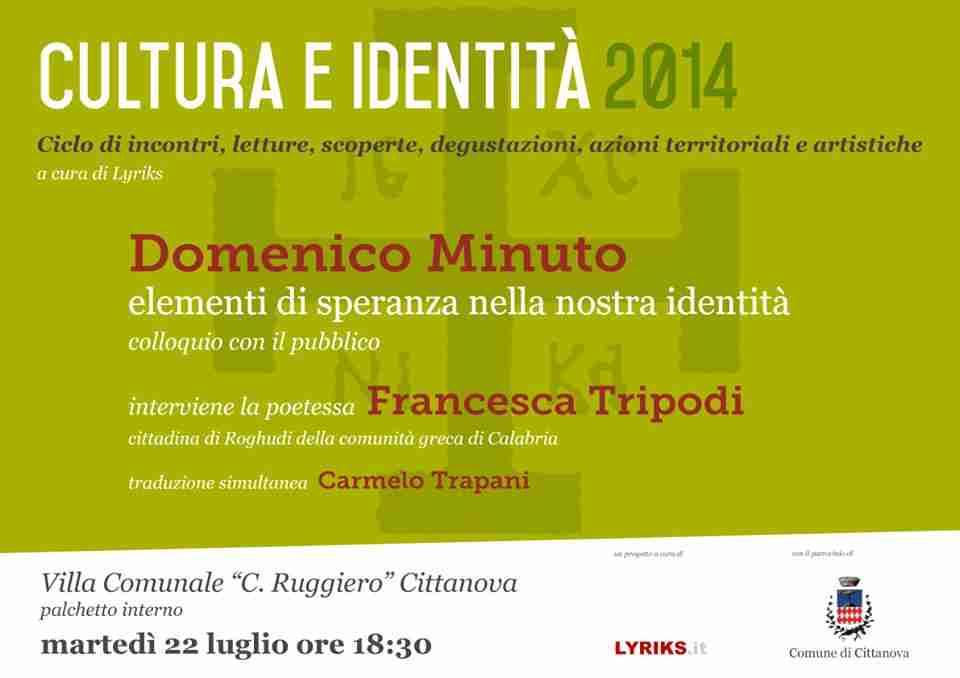 CITTANOVA – E’ previsto per oggi alle 18,30 negli spazi della Villa comunale, l’avvio di “Cultura e Identità 2014”, la manifestazione messa a punto da Lyriks con il patrocinio del comune di Cittanova.