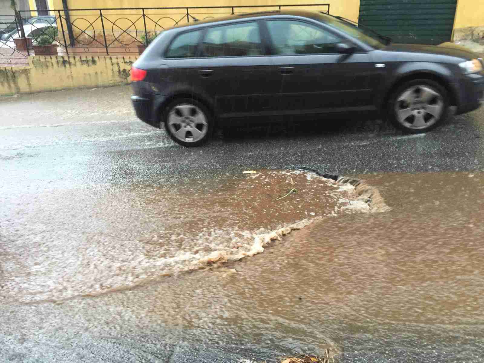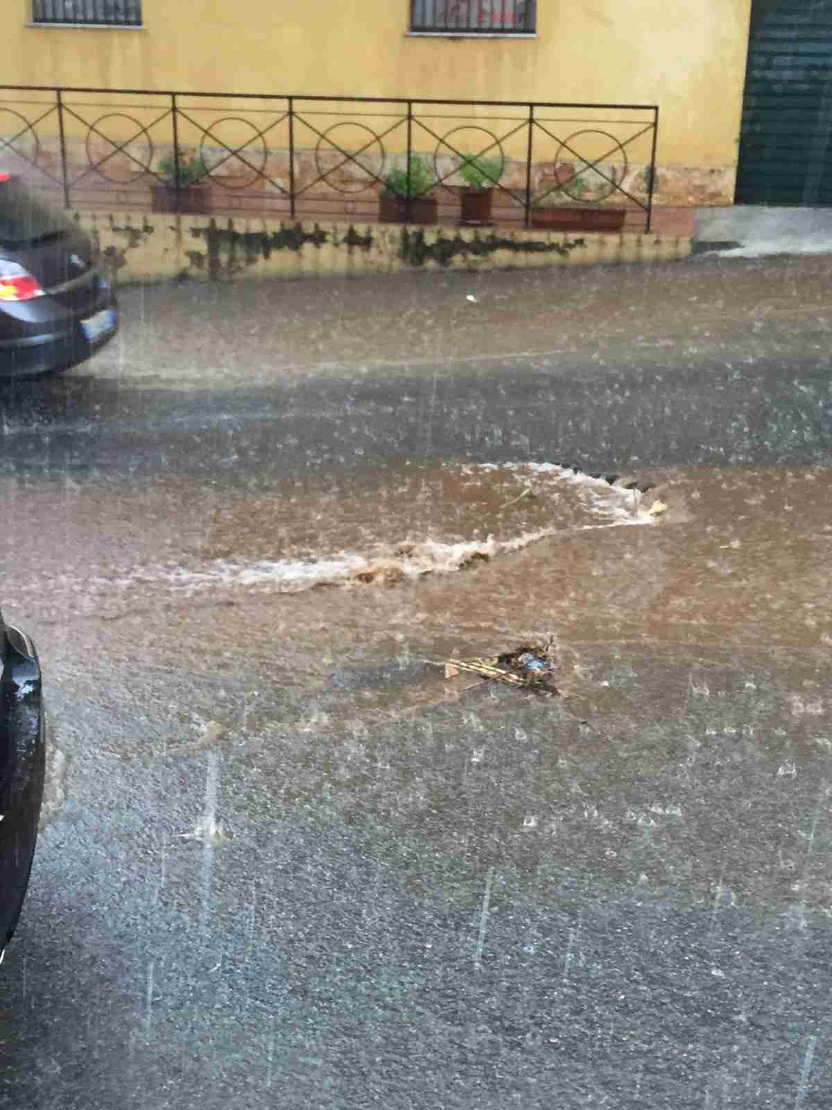 In via Roma, a due passi dal municipio, da un tombino è fuoriuscita dell’acqua. Allagamenti anche nella zona del Macello.