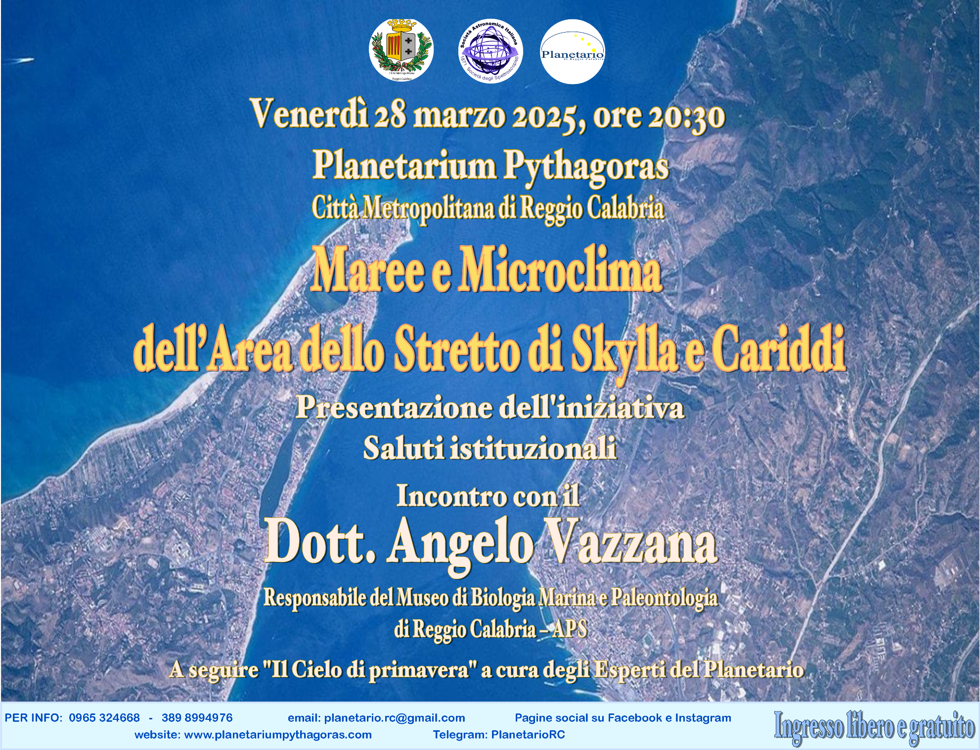 Venerdì 28 marzo 2025, alle ore 20:30, presso il Planetarium Pythagoras della Città di Reggio Calabria, il Dott. Angelo Vazzana, Responsabile del Museo di Biologia Marina e Paleontologia – APS, condurrà una conversazione intitolata “Maree e Microclima dell’Area dello Stretto di Skilla e Cariddi”.